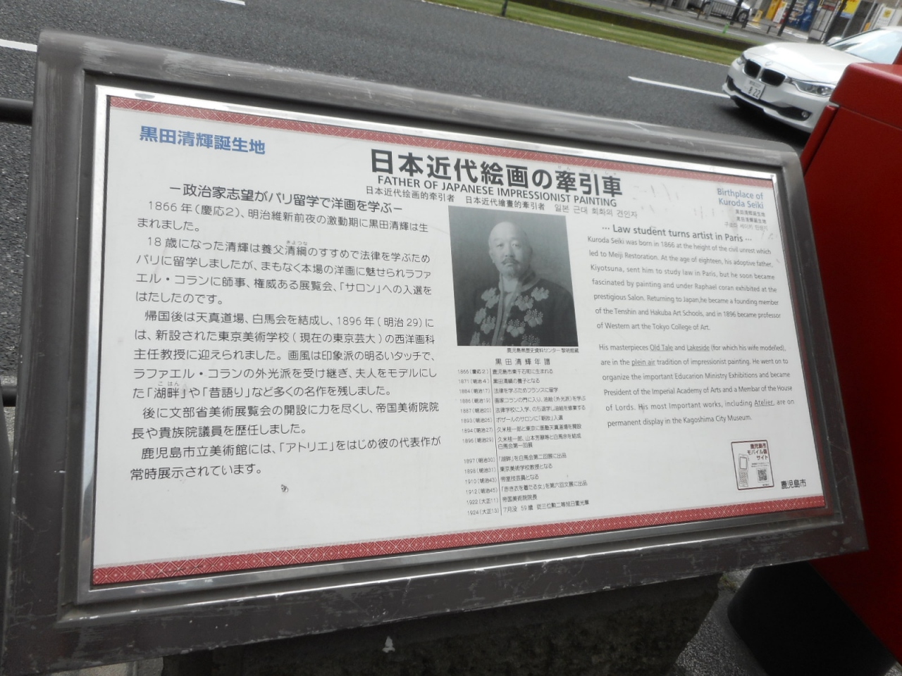 鹿児島市内にある像です。町中に急に現れます。黒田清輝とは、薩摩藩出身の画家で、パリなどに留学して洋画を学び、日本に広めた有名人物。その人が生まれたのが、天文館にほど近い現在大通り沿いの場所だったそうで、像とともに説明板や石碑などがありました。場所は便利でいいのですが、あまりに町中すぎてみんな素通り気味でしたが(笑)。