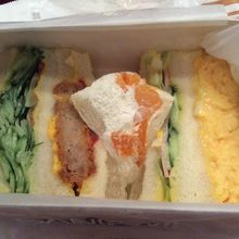 組み合わせフルーツを注文しましたが、中身はフルーツ、ハム、メンチカツ、卵、野菜サンドが各1つずつ。