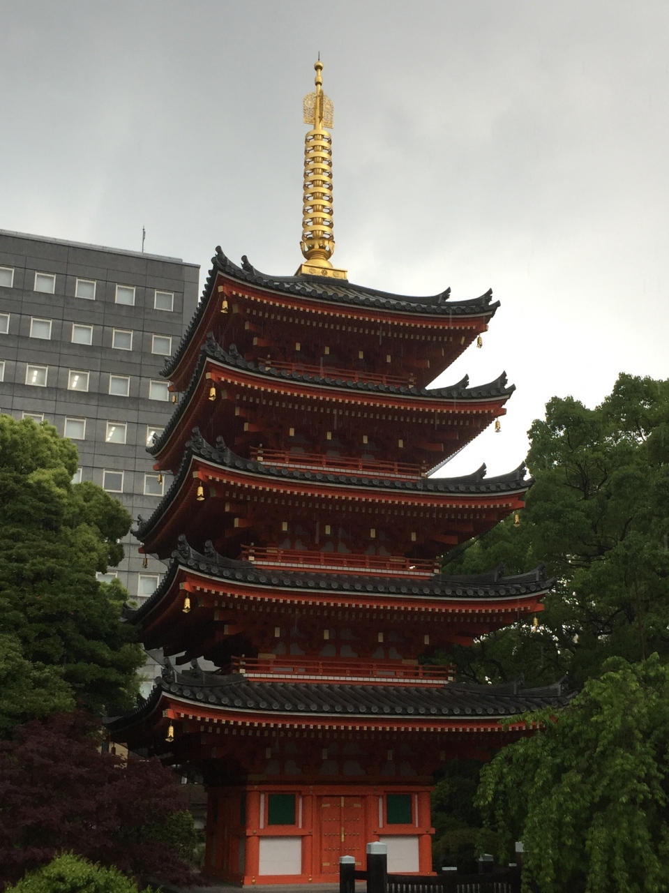 東長寺の境内にあります。平成23年に造られた総檜造りの新しい五重塔です。周りにある樹々の緑と相まって、朱色がとても映えて綺麗です。訪れた時は雨が強くなってきたので、本堂の庇の下からしか見ることが出来ず、残念です。