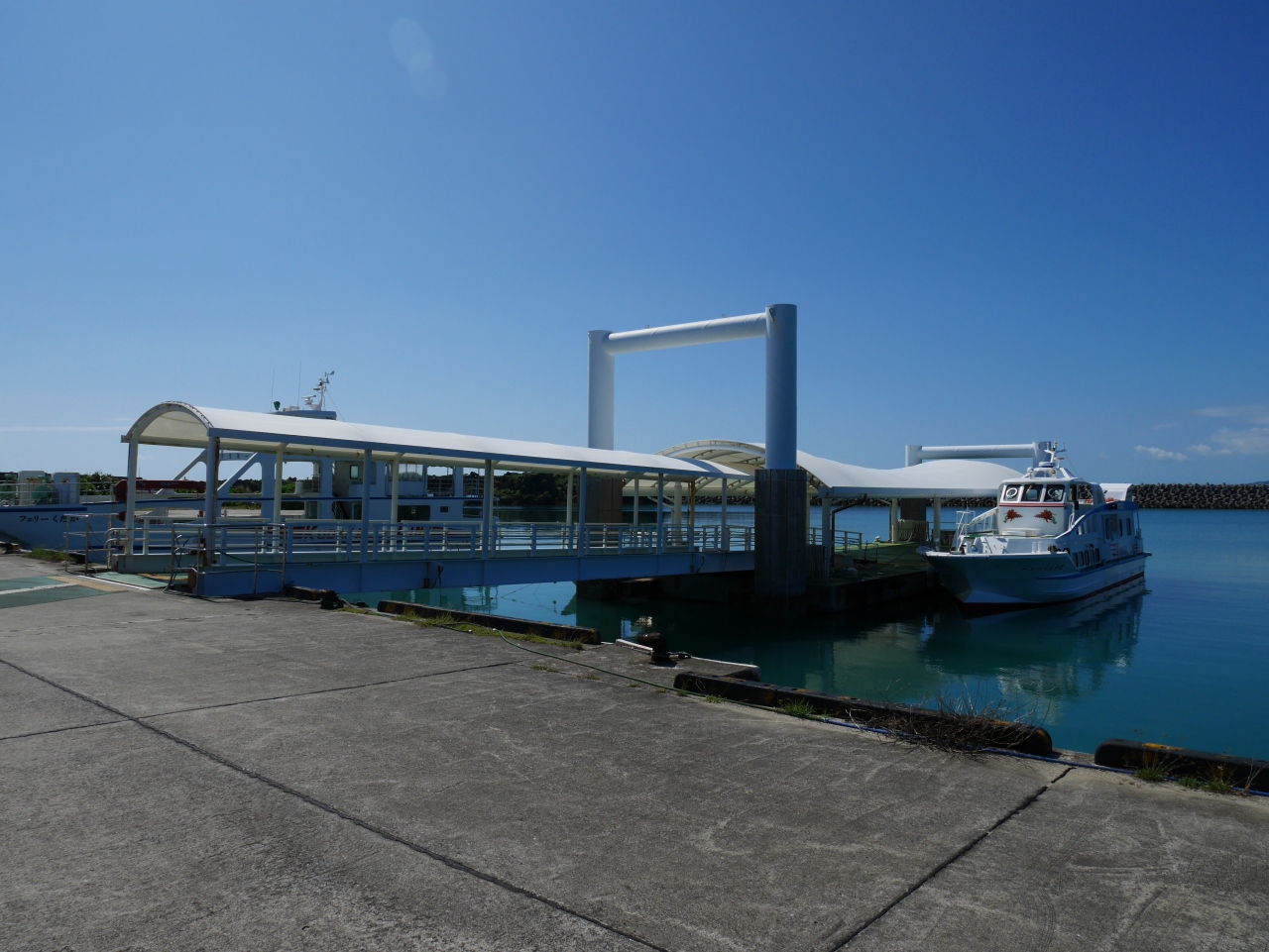 久高島には2つの港があります。一つは漁港で、もう一つがここ。ここは本島と結ぶ定期便のフェリーや高速艇が運航しています。人の少ない離島の港らしく、周りには建物も少なく何とも言えずのんびりとした雰囲気。船の乗船券は港ではなく、坂を上ったところで買わなければならないのが不便。