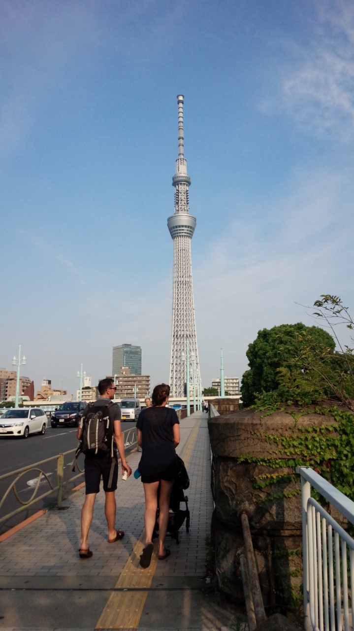 真の前にスカイツリーを眺めながら隅田川を渡ります。