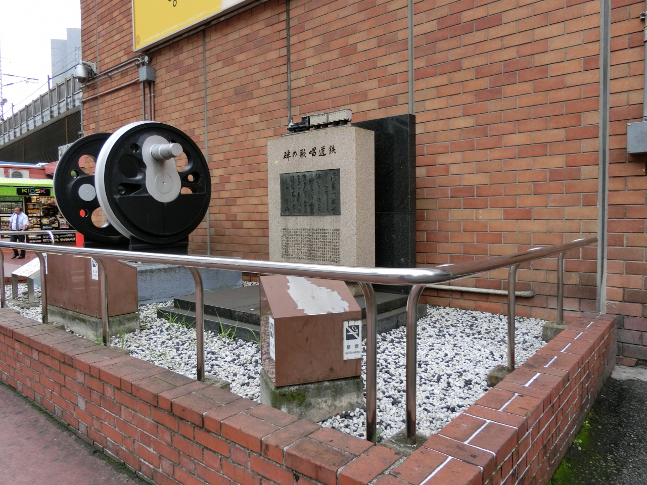 鉄道唱歌の記念碑。新橋-横浜間に日本初の鉄道が走った「汽笛一声新橋を♪」と唱われたの歌詞が刻まれていますが、達筆すぎて読めませんでした。