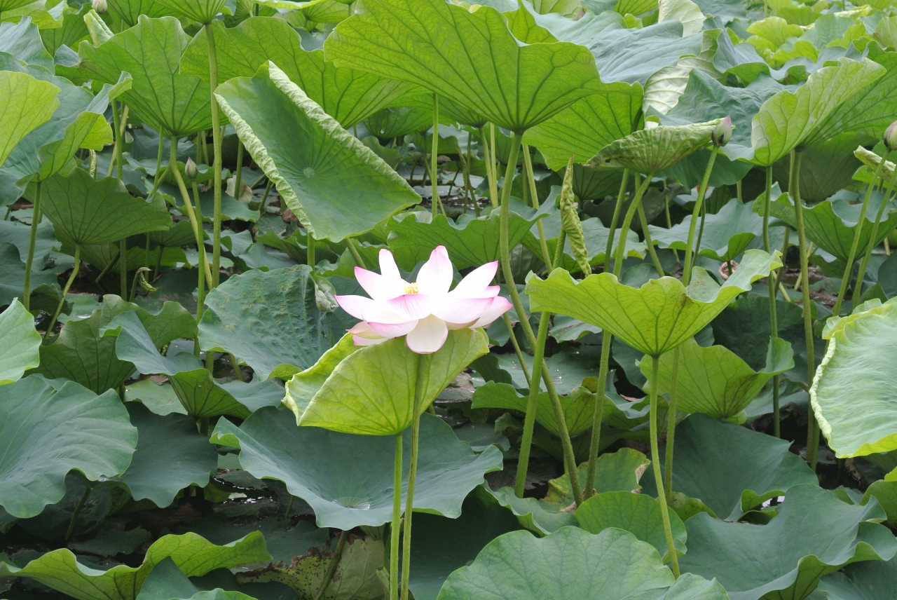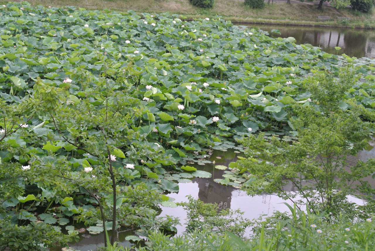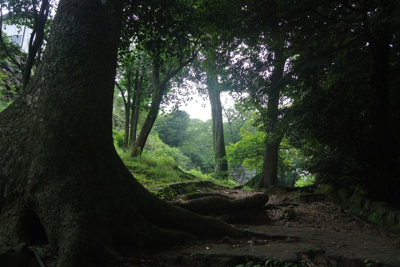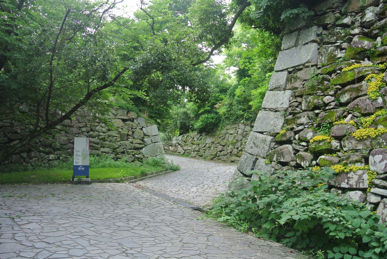 オリジナルで残っている建物は多聞櫓だけということで、それほど期待していなかったのですが、石垣などは予想以上にすばらしいものでした。急な坂や階段をのぼって本丸に上るとその規模なども実感できます。南丸のほうから上ると、木々がうっそうと茂っていて、人もいませんでしが、本丸まで行くとボランティアの方でしょうか、大勢の方が掃除をされていました。一部には堀も残り、ハスの花が見事に咲いていました。