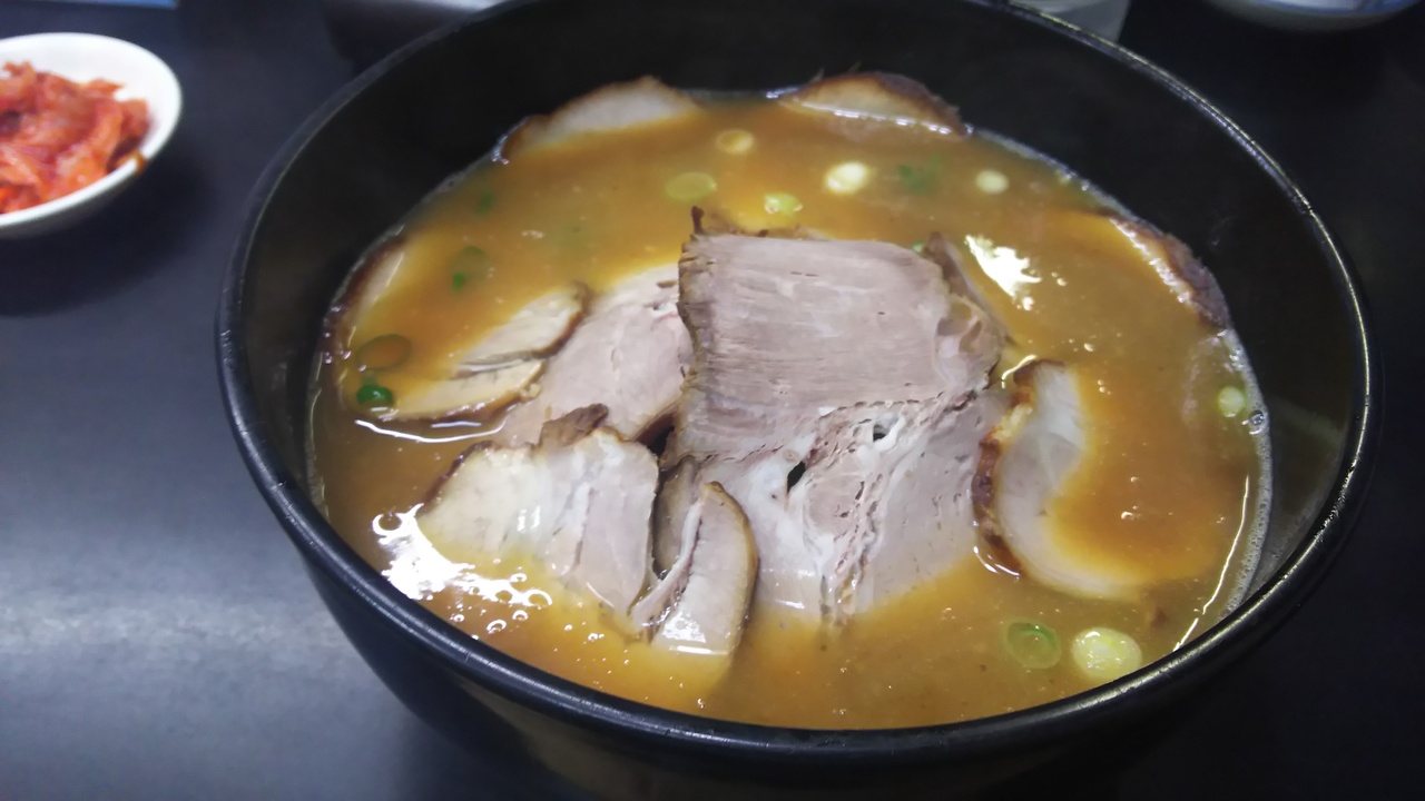 運動でおなかがすいたのでよりました。今回は半チャーシュー麺をチョイス。半チャーシュー麺とありますが、チャーシューが一面に乗ってあるのでうれしいですね。かみごたえのあるチャーシューで美味しいです。麺との相性も抜群ですね。