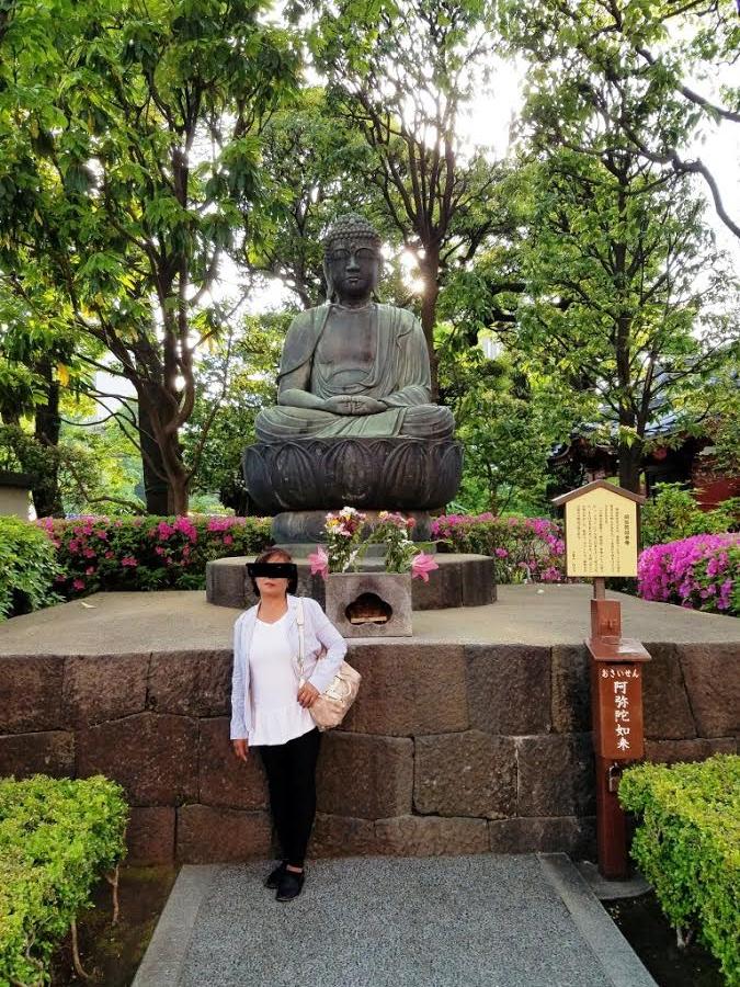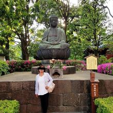 阿弥陀如来像は、浅草寺本堂から花やしきに向かう途中にある座像です。300年以上前に信者によって建てられ、本堂裏にあったものがこの場所に移されたということです。高さ2m近くの大仏さまはやさしいお顔で人々を見守っています。