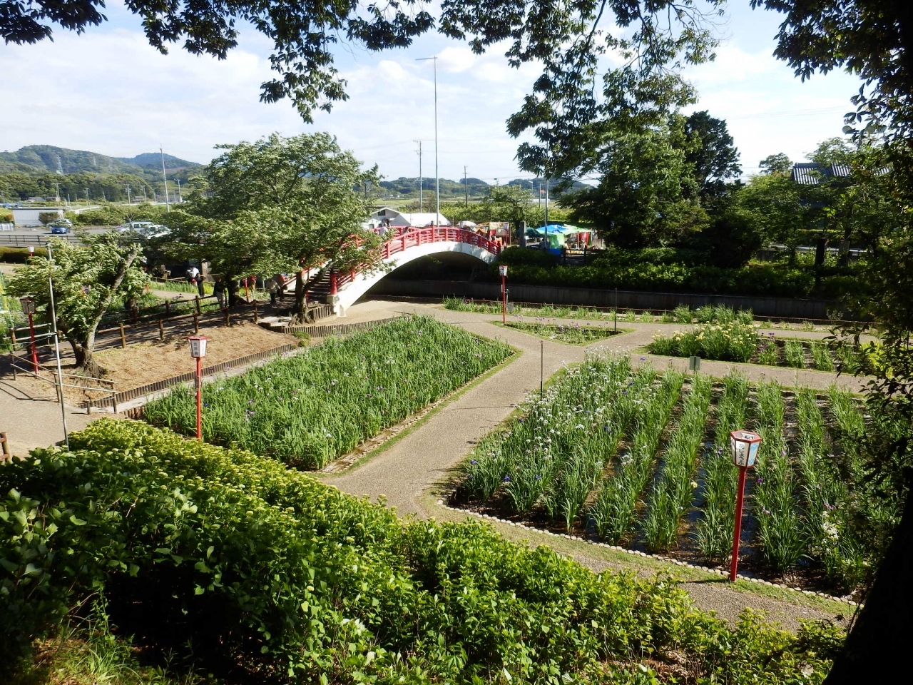 しょうぶ園の中央には赤い太鼓橋が架かり、橋の上からしょうぶを眺めることも出来ました。しょうぶ園はそれほど広くはなかったですが、散策路が設けられているので、一周して楽しむことが出来ました。