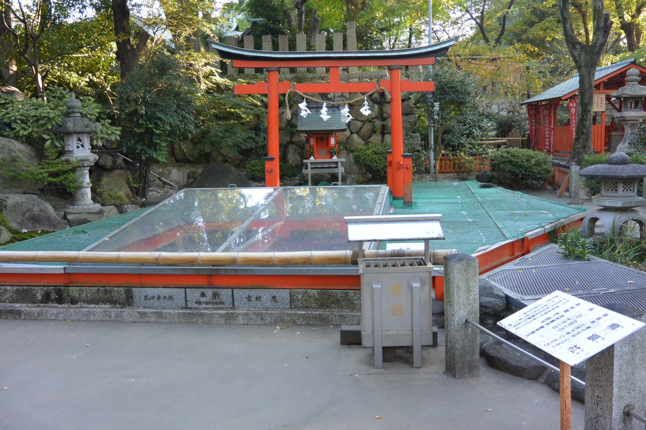 魚を扱う鮮魚商や漁師の信仰が篤い弁財天ということで、鳥居の前には小さな池があって鯉が泳いでいるのには、ちょっと驚きました。神社のお社は小さくて、むしろこの池が一番目立っていました。生国魂神社内にある摂社のひとつです。