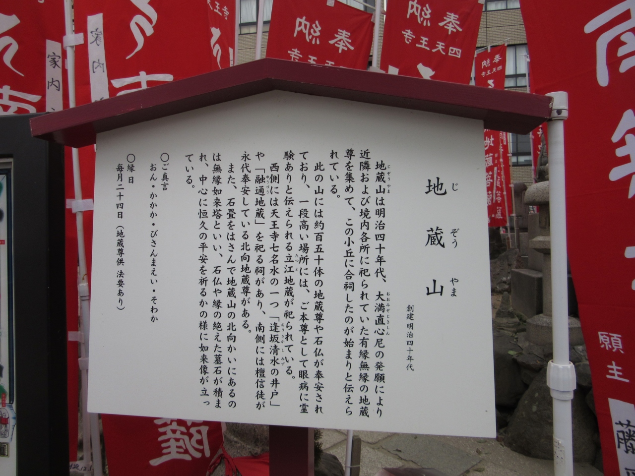 四天王寺の中の門から歩いて右手にお地蔵さんがたくさんあることが分かります。周辺にあったお地蔵さんをここに集められたそうで150体あります。行くと赤いのぼりがあります。見た感じ最近作られた施設のようです。