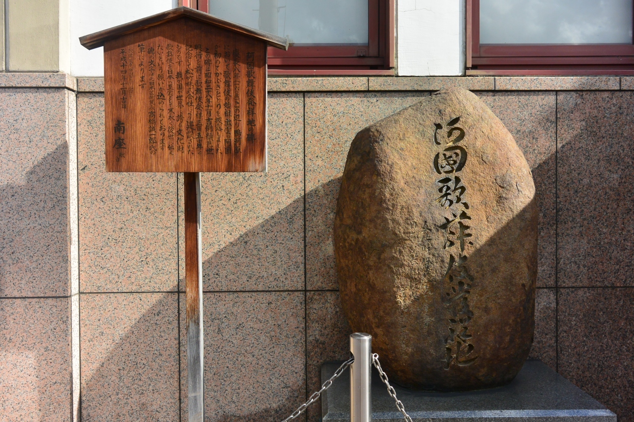 南座の正面ではなく、西側にあるので気がつく人は少ないかもしれません。石碑と説明板があります。現在南座が耐震工事中ですが、全面的に建て替えるわけではないので、この石碑が移動するということはないのではと思いますが、どうなのでしょう。