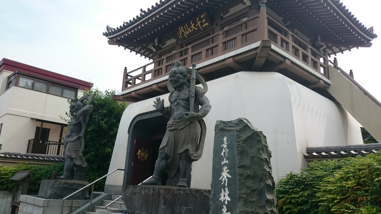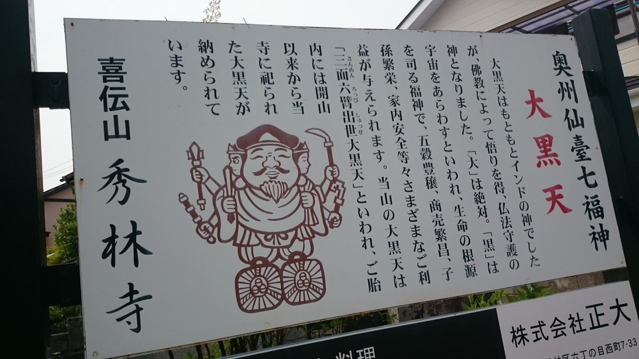 奥州仙臺七福神の一つで、五穀豊穣、商売繁盛、子孫繁栄、家内安全などさまざまなご利益があるそうです。山門の前には仁王様が立っています。庫院に大黒天の御尊像 が祀られていて、現存する本堂は仙台市では最古の木造本堂だそうです。