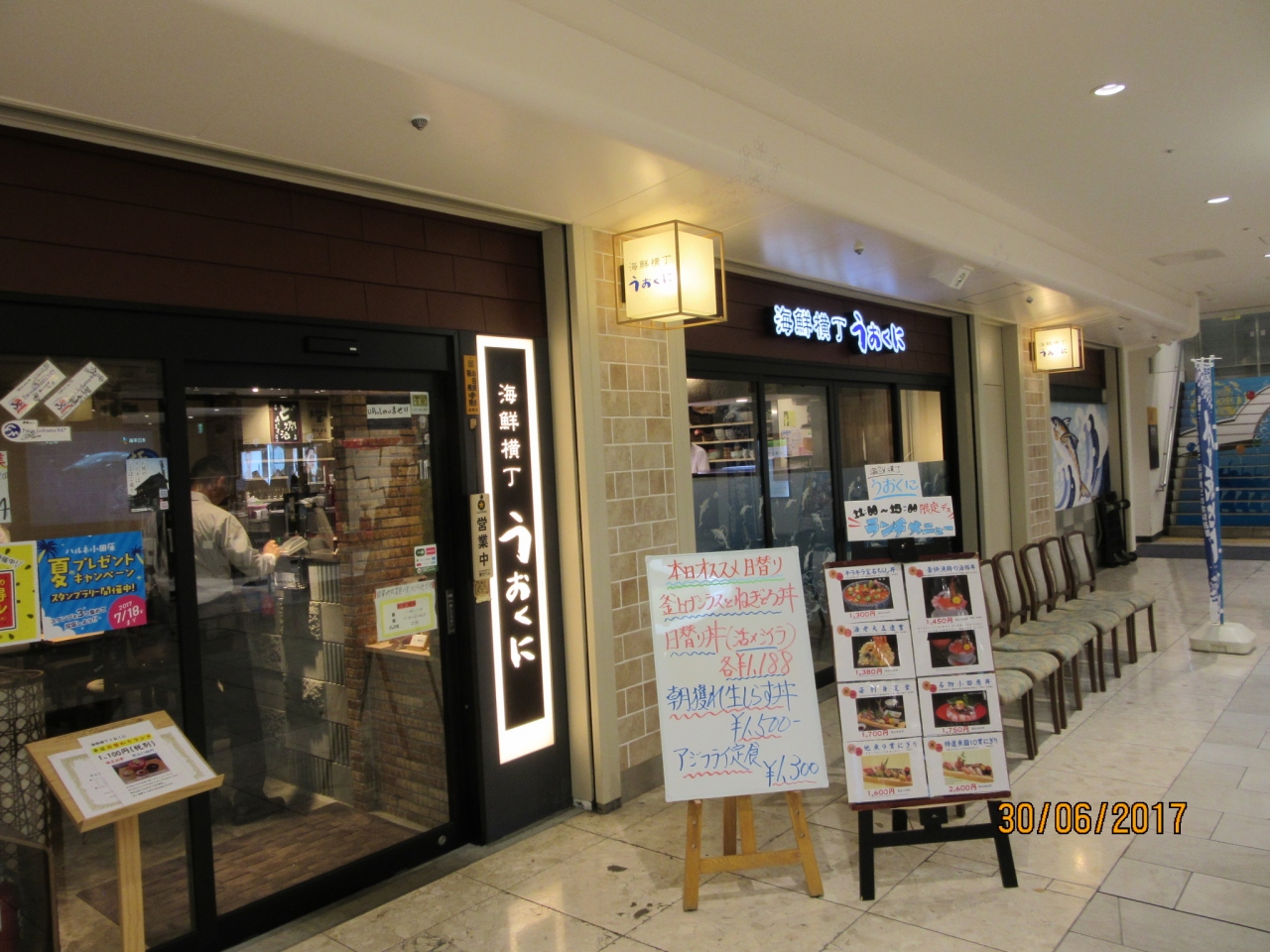近くのテーブルの客が【海老天5連重】を注文したが、海老天が5尾のってとても美味しそうだった。カウンターはないがテーブルが多数あり、一人でも2人掛けテーブルに案内されるので入りやすい。おススメのランチ・飲みの店。店の名前は【海鮮横丁うおくに】でした。