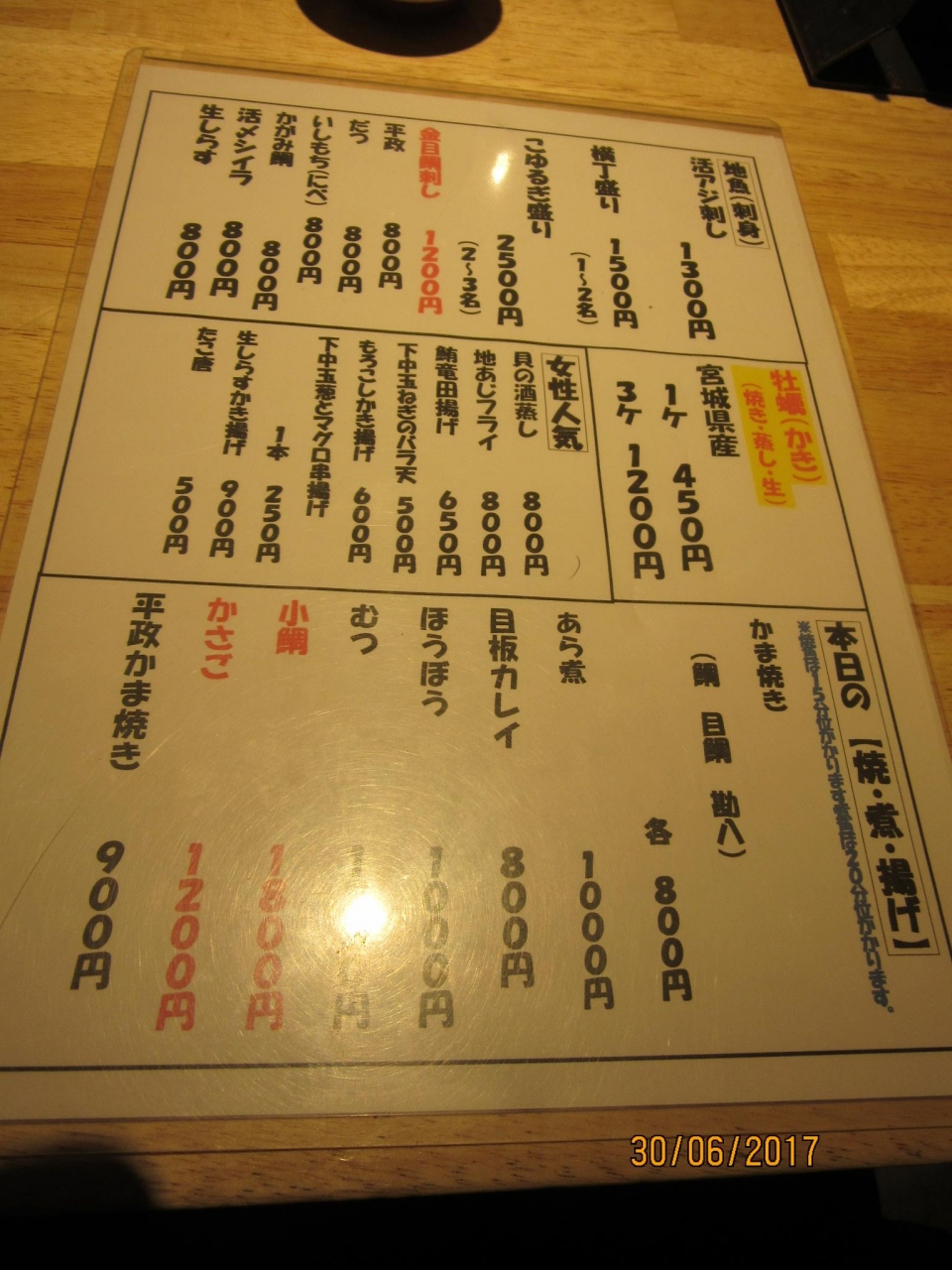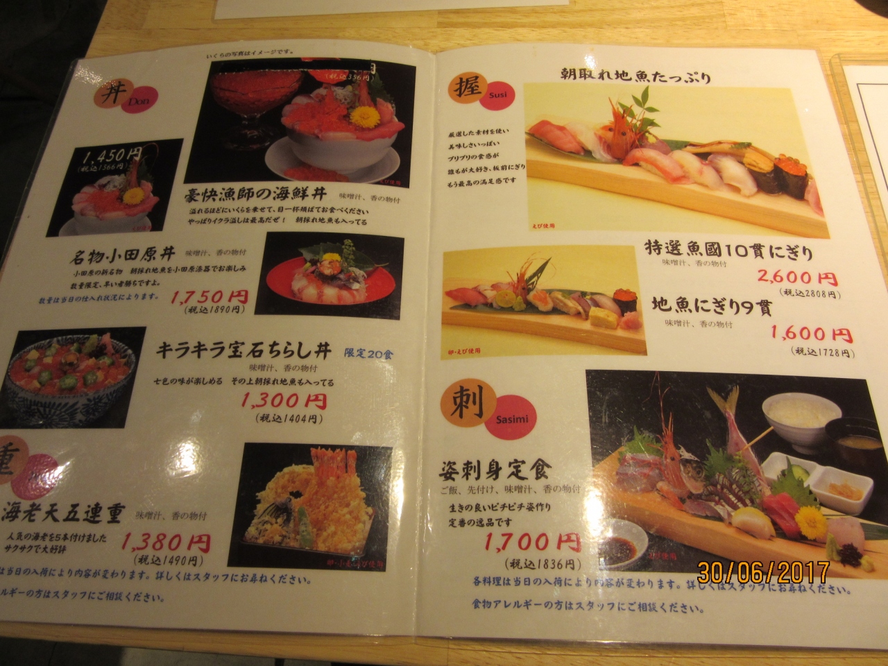こちらは土日のランチタイムでもさほど混んでいません。料理も海鮮料理を中心に充実していて、スタッフも調理人・サービススタッフともに明るく爽やかで気持ちの良い接客でした。メニューは日替わりランチ(20食限定)1,188円。アジフライ定食1,300円、生シラス丼1,500円、釜揚げシラスとねぎとろ丼1,188円、他に一品料理として活アジ刺し1,300円、金目鯛刺身1,200円などがありました。