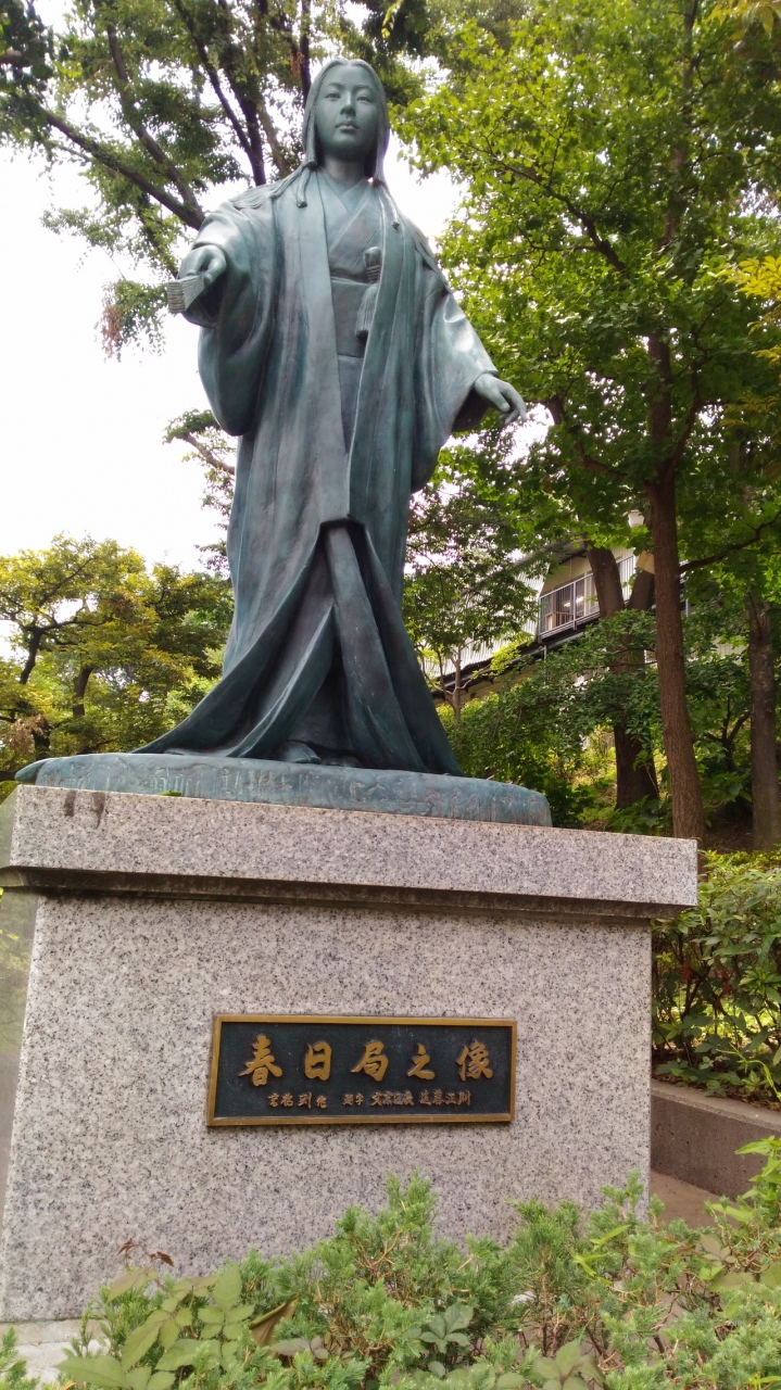 地下鉄後楽園駅を出てすぐ、礫石公園を出た場所に立つ像です。春日局は、若い人には馴染みがないかもしれませんが、徳川三代将軍家光の乳母で、両親に疎まれていた家光をかわいがったと言われています。春日局の縁で出世した大名家もありますし、武士の娘の身ながら御所にも昇殿するなど、将軍との私的なつながりで権力を持った女性でした。この像が建つあたりは住所も彼女にちなんで春日となっていますし、前の通りは春日通りと今も名前を残していますので、後楽園にいらした際には、ぜひご覧になってみてください。