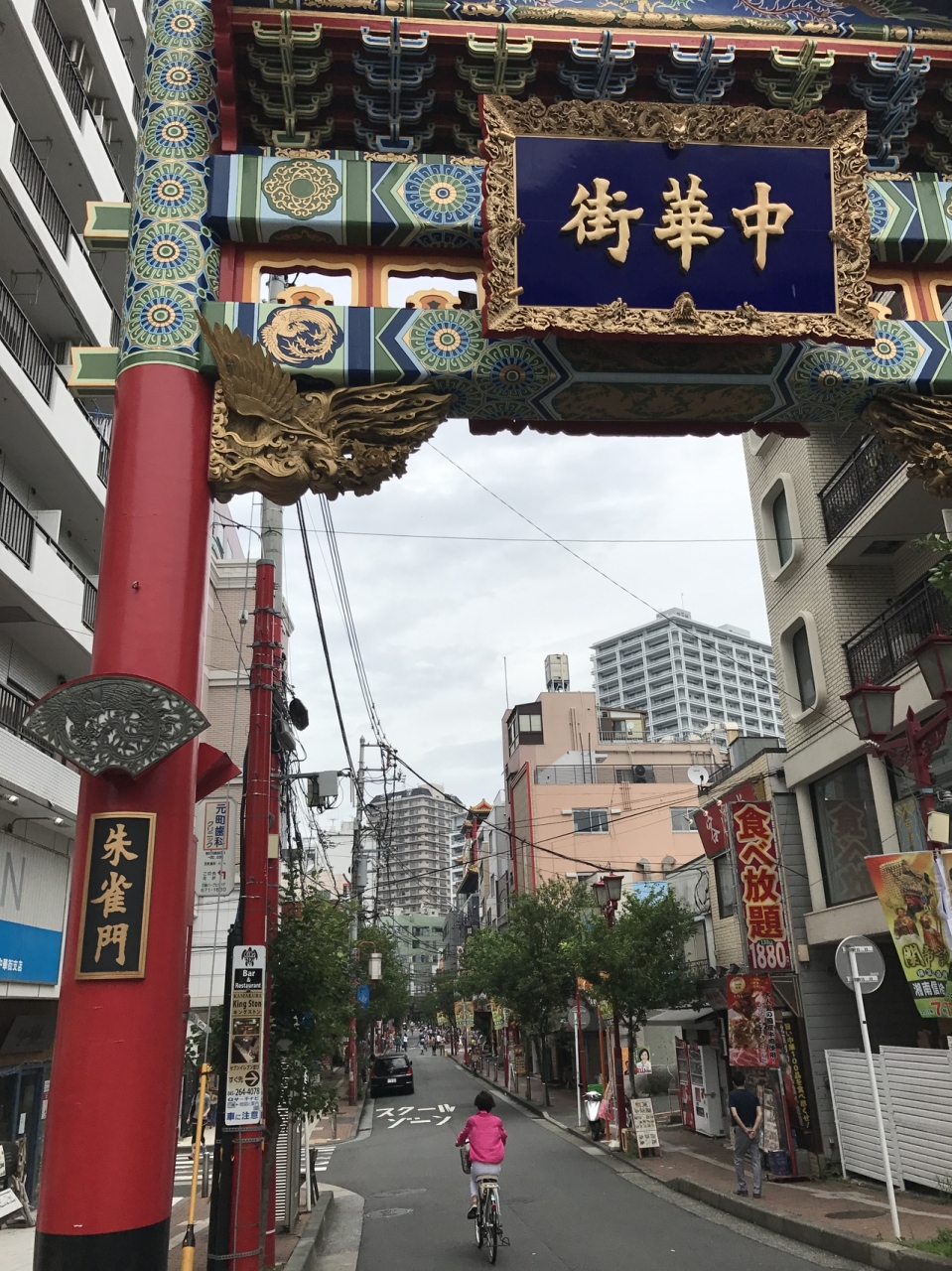 横浜中華街の外周りにあたる、4基の門があります。ひときわ目をひく、あでやかさがあるこの門は、南側に位置する朱雀門であります。朱雀門の文字の下や、その両側にはあでやかな羽を広げた朱雀の姿が見られ、厄災をはらい福を招いてくれます。
