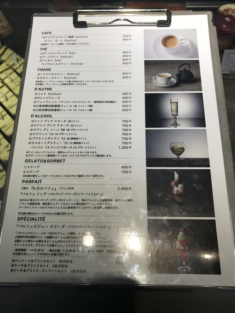 パフェは定番と月替りの2種あります。どちらも飲み物とセットで税後だと2500円少々。ただしセットの飲み物は単価700円のワインも選択可能なのがポイント高いです。