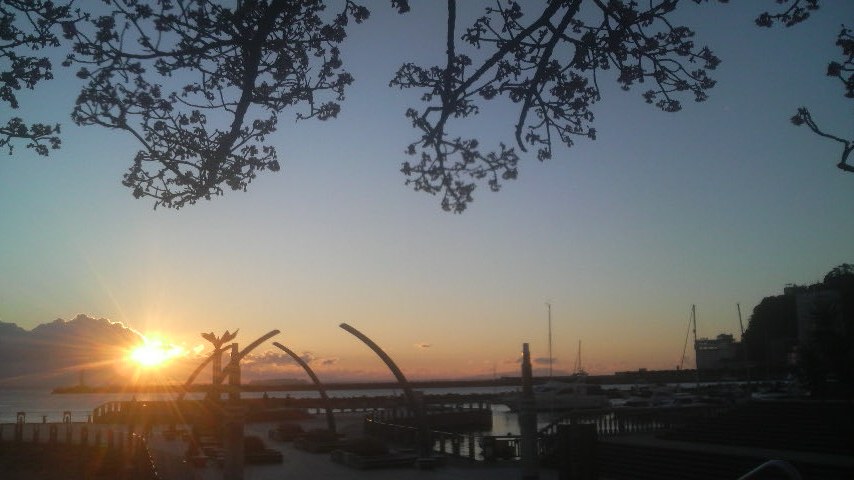 朝7時少し前にきれいな太陽が見え、ビーチ周辺のヨットやオブジェが並ぶテラス、さらに砂浜の端の方で咲いてる桜の木が徐々に朝日に染まっていく様子はなかなか見事でした。