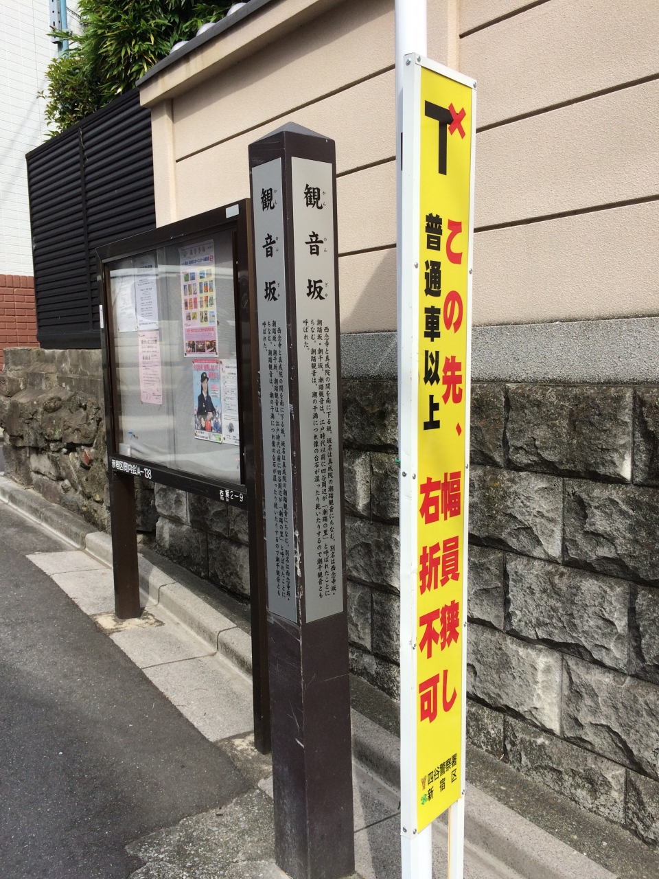 お寺が多い四谷エリアにある観音坂。観音坂の由来となった観音様は消失しています。この坂のある道は道幅も狭く、すれ違うのも一苦労するような道ですので、車が来たらゆっくりもしていられませんが、昼間はほとんど車もこないような坂です。