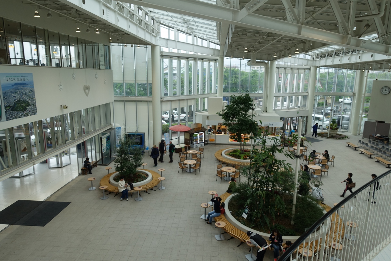 五稜郭タワーの1階部分、半分はお土産屋さん、半分はテラスになっています。カフェスタンドには軽食(スナック類)もあり、このテラスで飲食することができます。天井が高く開放的な雰囲気で、幕末・維新にちなんだ展示もされています。
