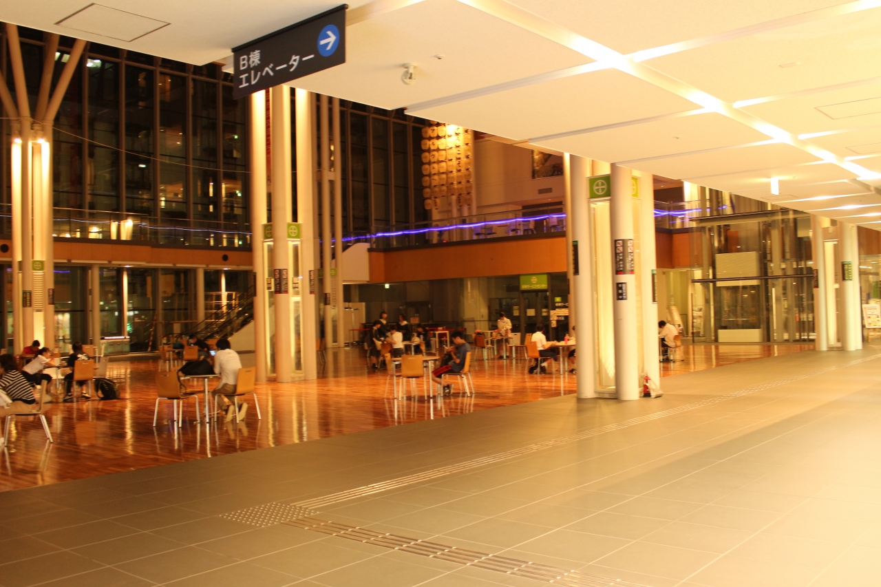秋田駅の東口にある複合施設で、飲食店やネットカフェ、コンビニ等があり、1階の吹き抜けスペースが無料の休憩所のような感じでした。