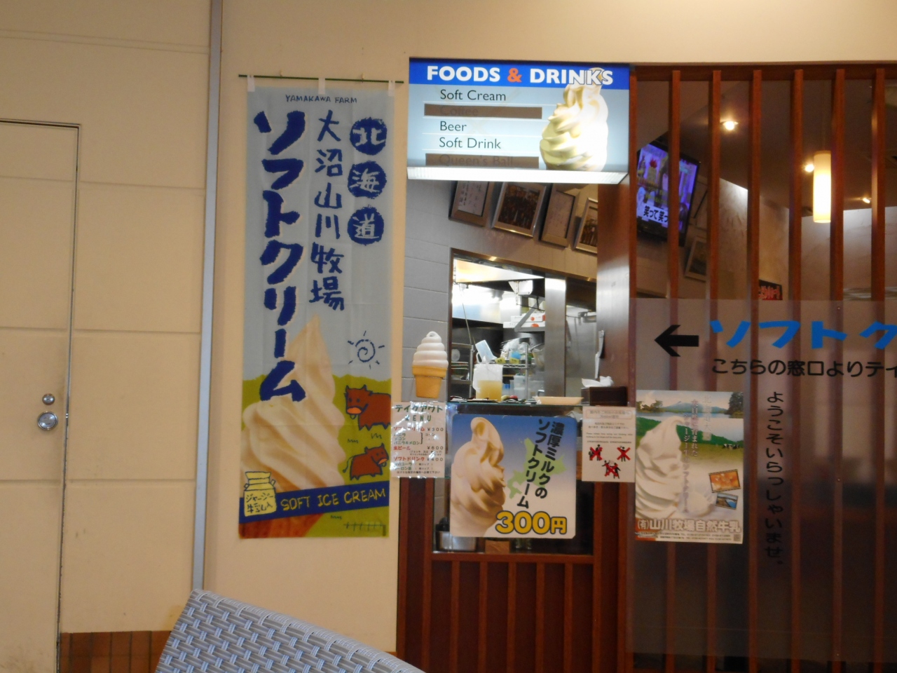 今日は、ラーメン気分ではなかったが、ソフトクリームを食べようと空港ビル内で探していると意外に少なく、ここに寄った。ソフトクリームは大沼公園の山川牧場牛乳ソフトで市内の観光地では350円で売られているところもあるが、ここは300円と良心価格で、しかもメロン味がある。
