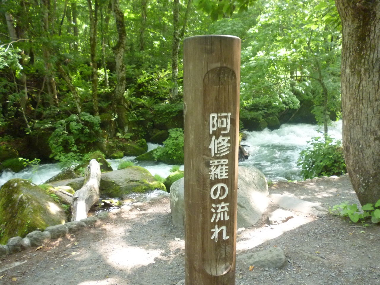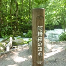 奥入瀬渓流の散策道は、人のみでレンタサイクルと車はこの道を走ります。途中の見どころには案内板が立っているので、自転車を止めて、散策道に下りて行きます。近くで滝や豪快な流れが見えました。車の場合は、数か所駐車場があります。