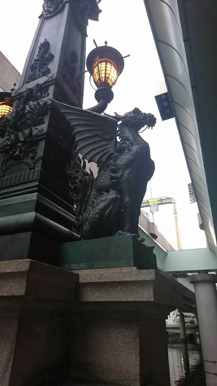 日本橋を渡るときに必ず目にする麒麟。羽を広げた伝説の動物は日本橋の支柱の上に4体います。迫力ある姿で観光客が写真を撮っているのを見かけますが、自由に空を飛び回る麒麟なのに、高速道路の下に置かれているのが残念です。