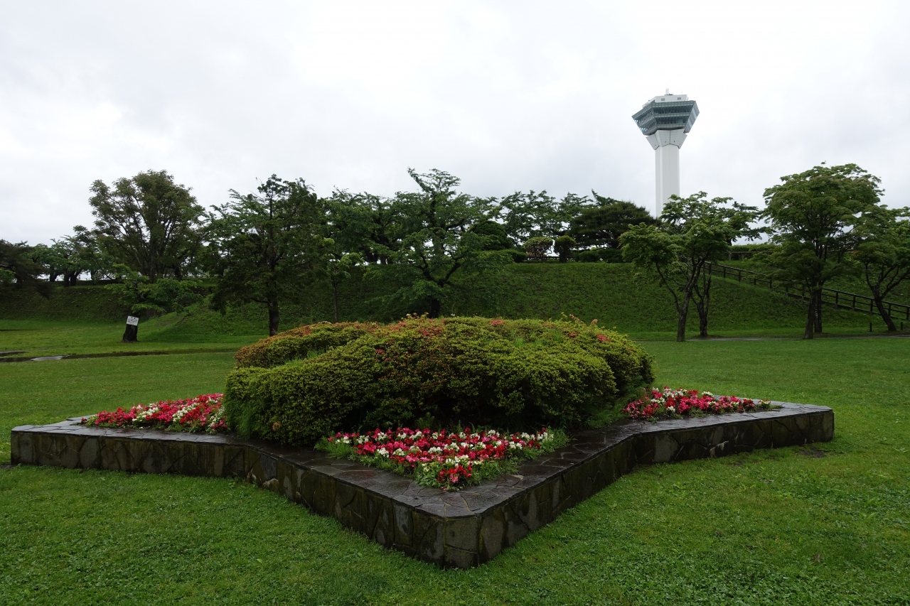 濠の周辺を含む五稜郭跡一帯が五稜郭公園になっていて、濠の中側にも無料で入ることができます。五稜郭公園の真ん中には箱館奉行所跡がありますが、ここだけ有料です。ただ当たり前ですが、五稜郭の中からは、その特徴的な星形の形はみられません。