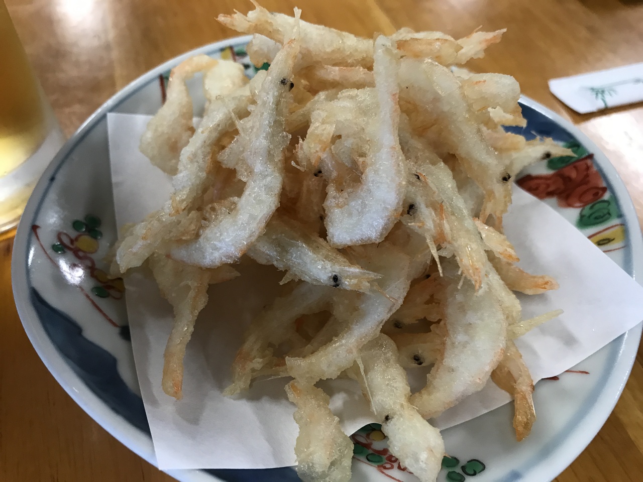 白えびの天ぷらと隣から持ち込んだほたるいかの昆布〆をアテに瓶ビールをいただきました。