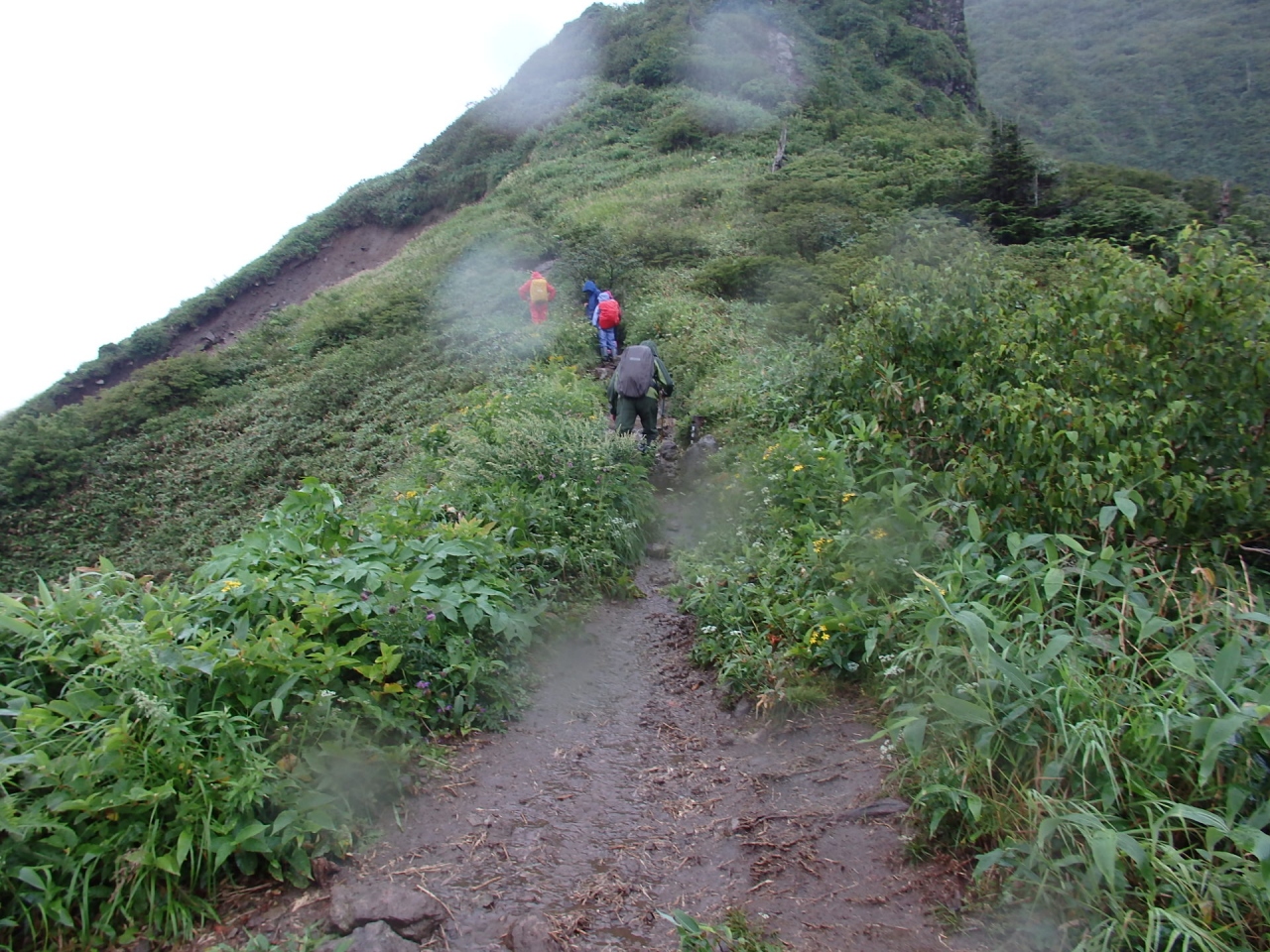 雨の中祓川登山口駐車場を出発。35分後木段、岩道の急登りが始まる。雨が強くなり登山道に水が流れる。出発から3時間20分湿原通過。湿原植物が見られる。又急登り。高山植物が多く見られる。5時間40分、本日の宿泊先「苗場山自然体験交流センター」に到着。本日は他の宿泊客はおらず、我々11人の貸切状態。夕食のカレーはおいしかった。本日のコースは標高差もあり、また多くが岩場の急登り、更に雨も重なって滑りやすく、きついコースでした。天気が良ければ、素晴らしい眺望でしょう。雨にもかかわらず、野花も多く見られ満足できる登りでした