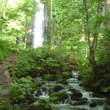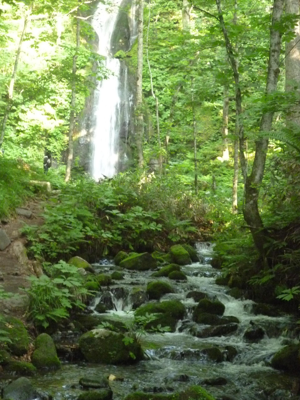 焼山から子ノ口に向かって、車で行きました。渓流とは車道を挟んで向かい側に雲井の滝がありました。案内のポールが立っていたのでわかりました。高くから流れ落ちていました。山の緑と滝の水しぶきの白が、すがすがしい渓流の雰囲気を高めていました。