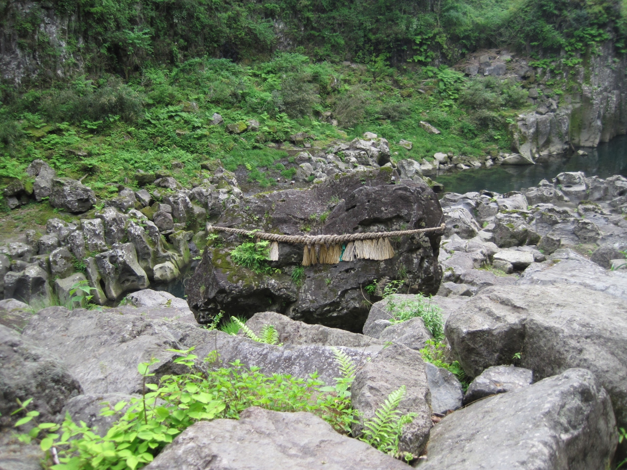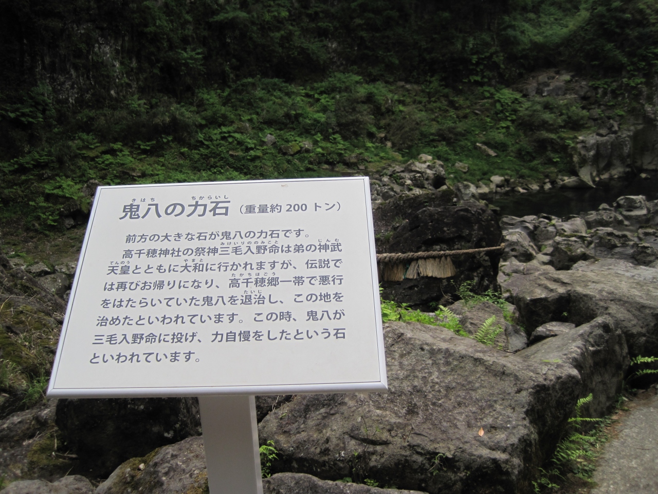 遊歩道の途中にある大きな石です。高千穂郷一帯で悪行をはたらいていた鬼八が退治された時に力自慢をしたという石といわれているそうです。比較対象がありませんが、遠目から見てもかなり大きな石でした。重さも約200トンだそうです。