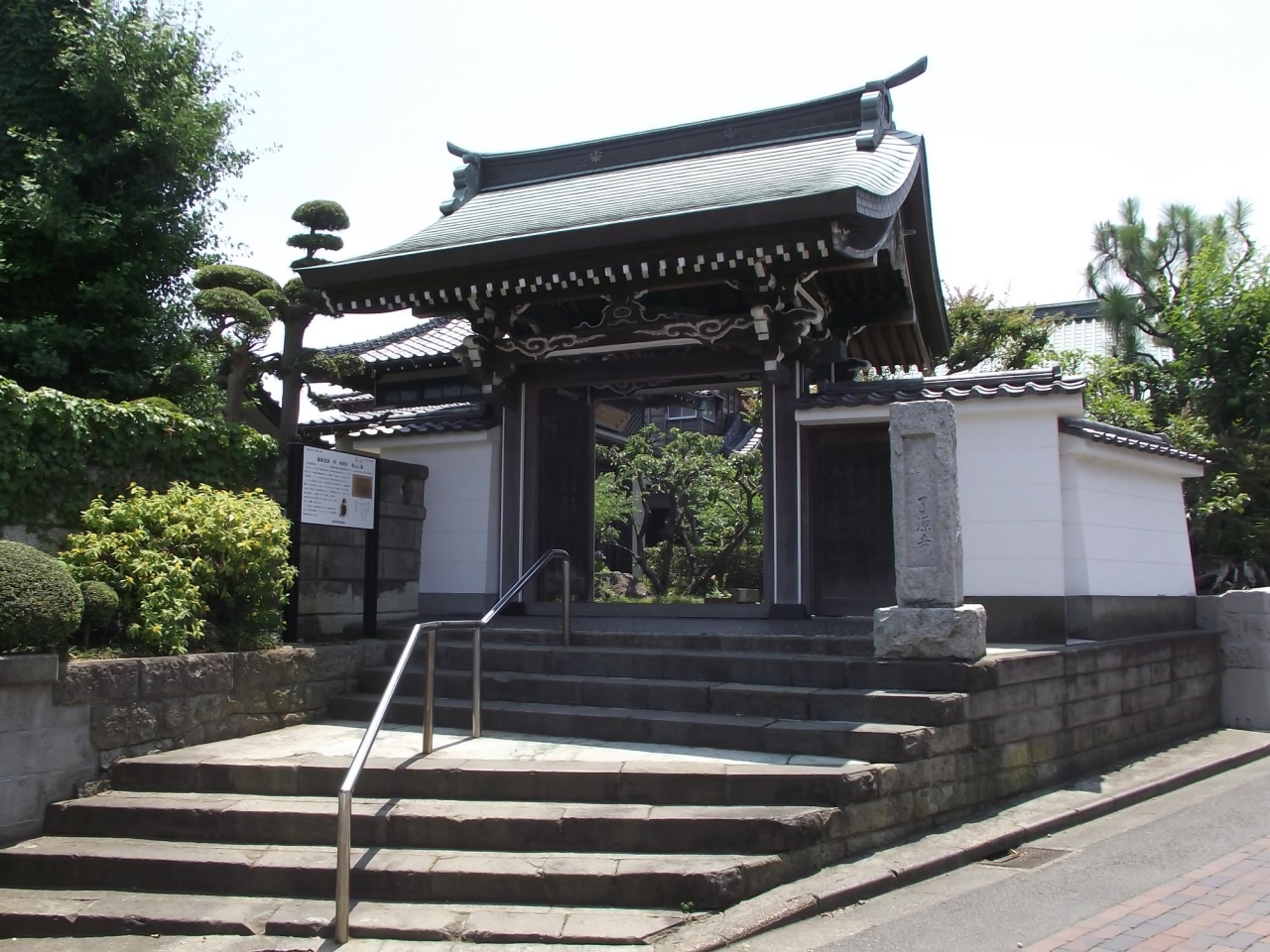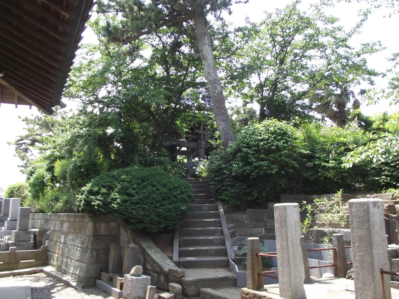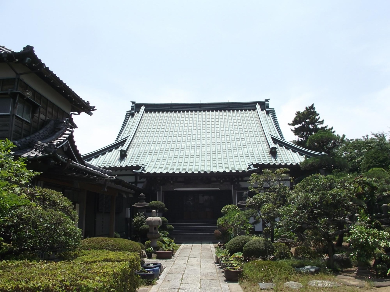 京成本線・大神宮下駅から北東方向に歩いて5,6分、船橋大神宮 (意富比神社) の東側の狭い通路沿いにある寺院です。