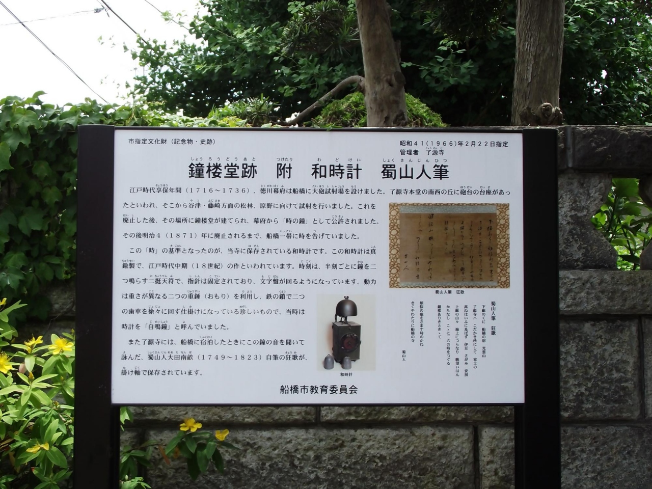 この「時」の基準となった和時計が、また、蜀山人大田南畝が船橋に宿泊した時、この鐘の音を聞いて詠んだ狂歌の自筆の掛け軸が保存されている 由。