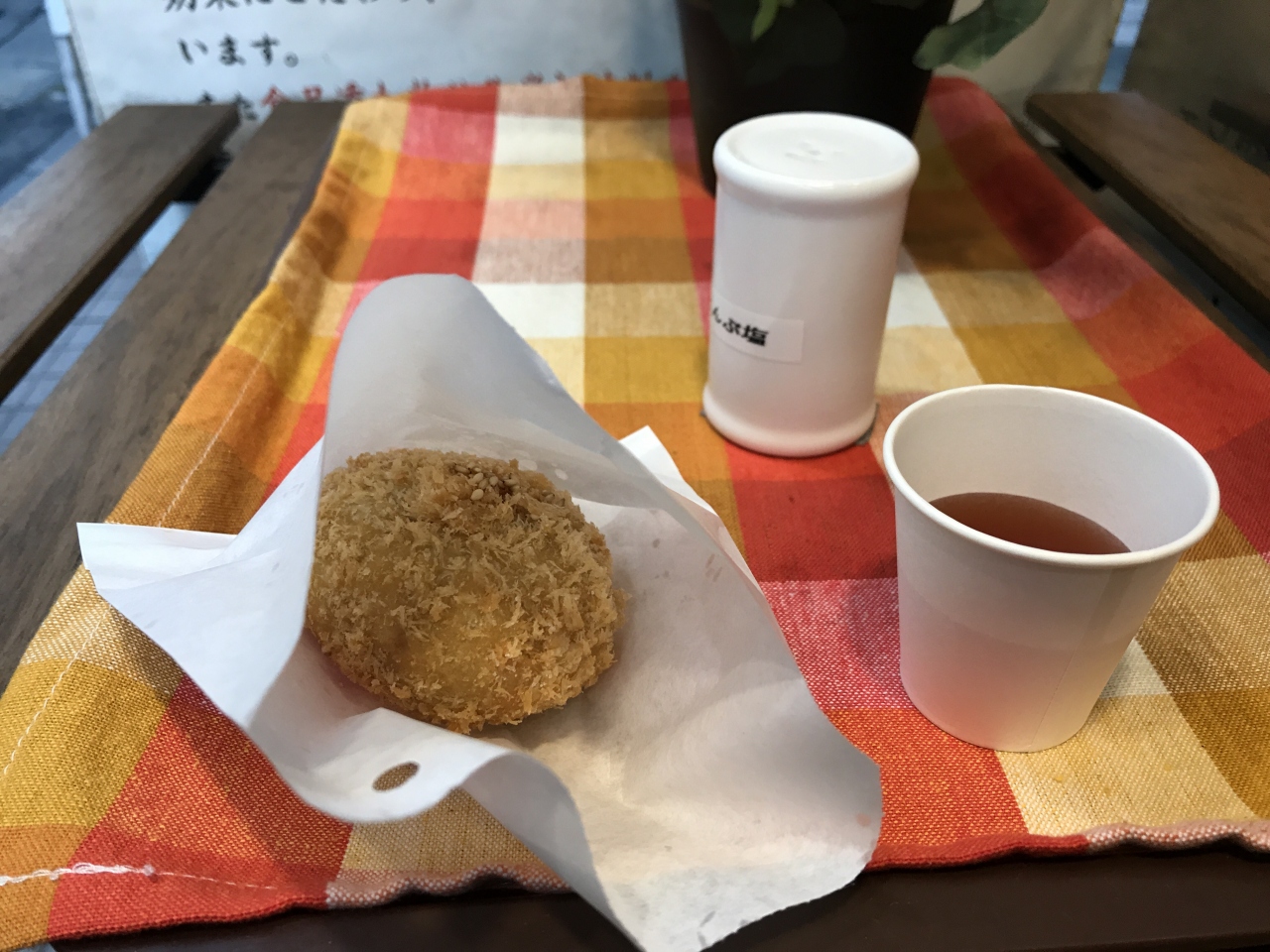また、ここのコロッケはソースではなく昆布塩を少しかけて食べます(テイクアウトの場合は昆布塩か入った小さな袋を別にくれる)。確かにソースをつけるとジャガイモや肉の味が無くなってしまうかも。昆布塩もつけるのではなく、少し振る程度が良いみたい。