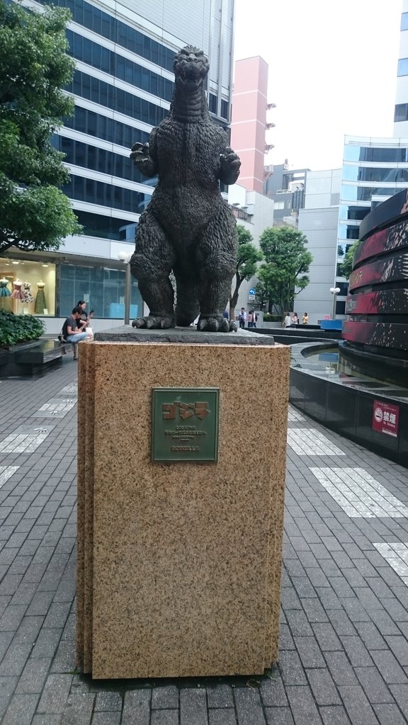 台座含めて高さ2.2mの銅像で、初代ゴジラを模して、台座には1作目のラストで語られる「このゴジラが最後の一匹だとは思えない。古生物博士山根恭平 1954年11月3日」と記されたレリーフが付けられています(1954年11月3日は、映画『ゴジラ』の封切り日)。