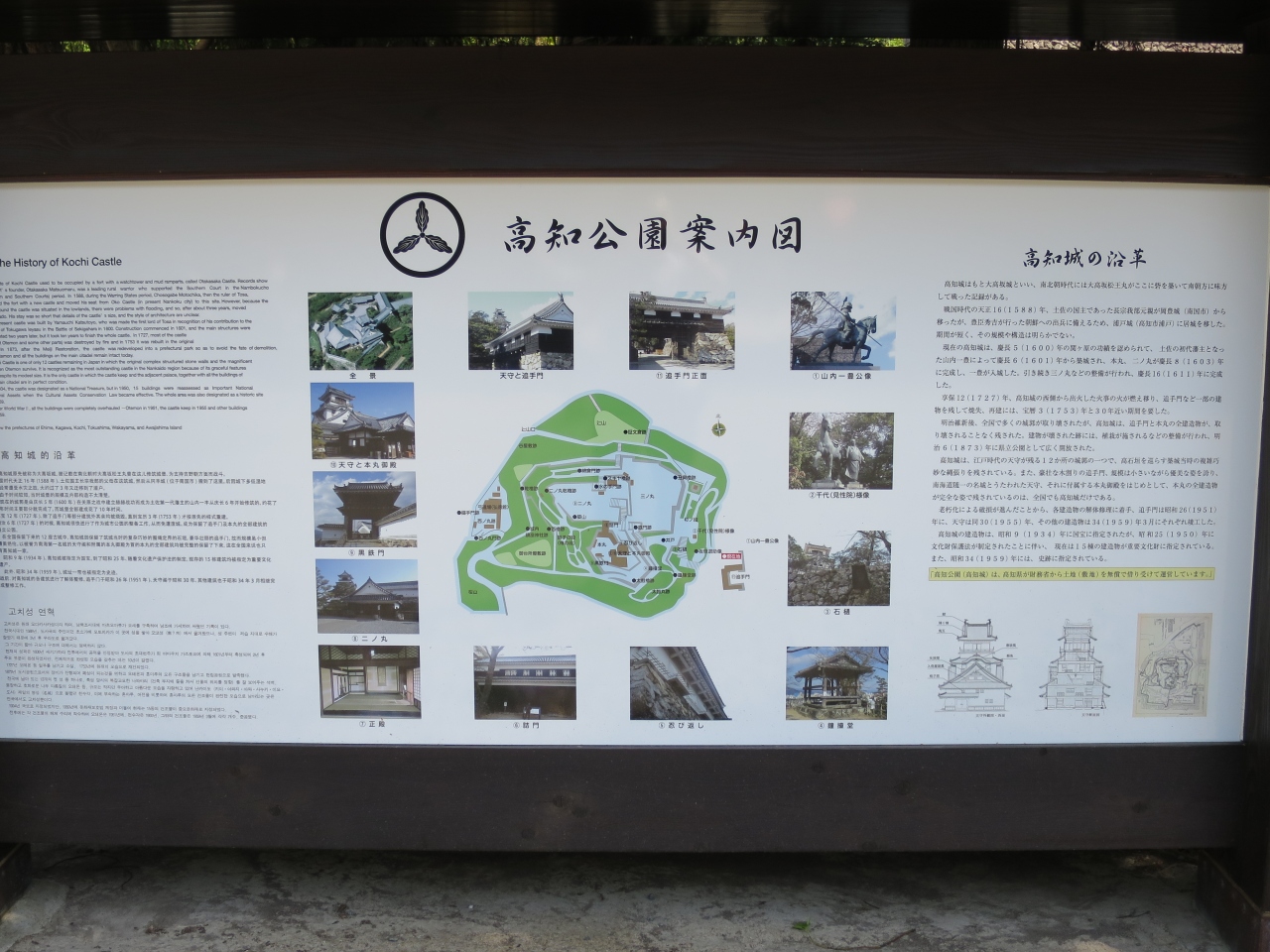 高知市の城下町の中心高知城を核とした城跡公園です。園内には天守、懐徳館(本丸御殿)、黒鉄門、詰門、追手門等の重要文化財、石垣、石樋等の城郭、板垣退助、山内一豊等の銅像等見所が沢山ありしっかり見て回ると2時間以上掛かります。またそれ以外にも緑が多く新緑の時期には歩いていると清々しさを感じられる公園です。