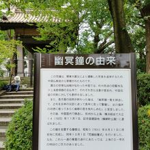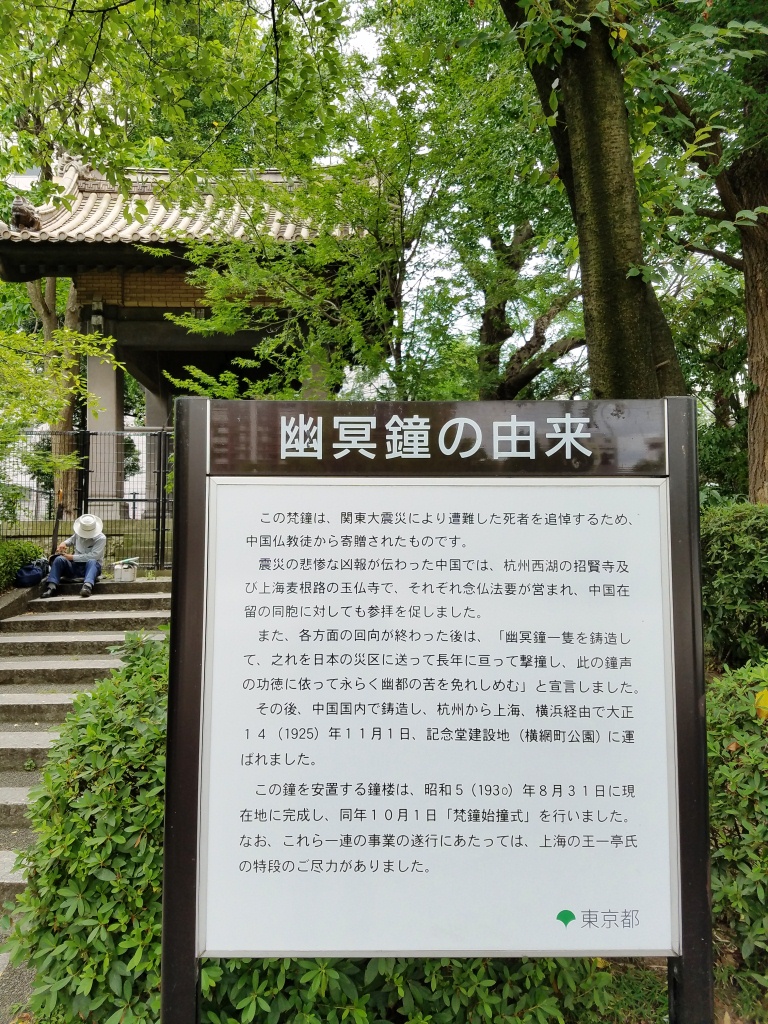 幽冥鐘は都立横網町公園内の小高い場所にある鐘です。関東大震災の甚大な被害はすぐに中国国内に伝わり各地で慰霊が行われたそうです。鐘は中国仏教徒が国内で造りこの地に運ばれ、のちに作られた鐘楼とともに現在でも褪せることはありません。