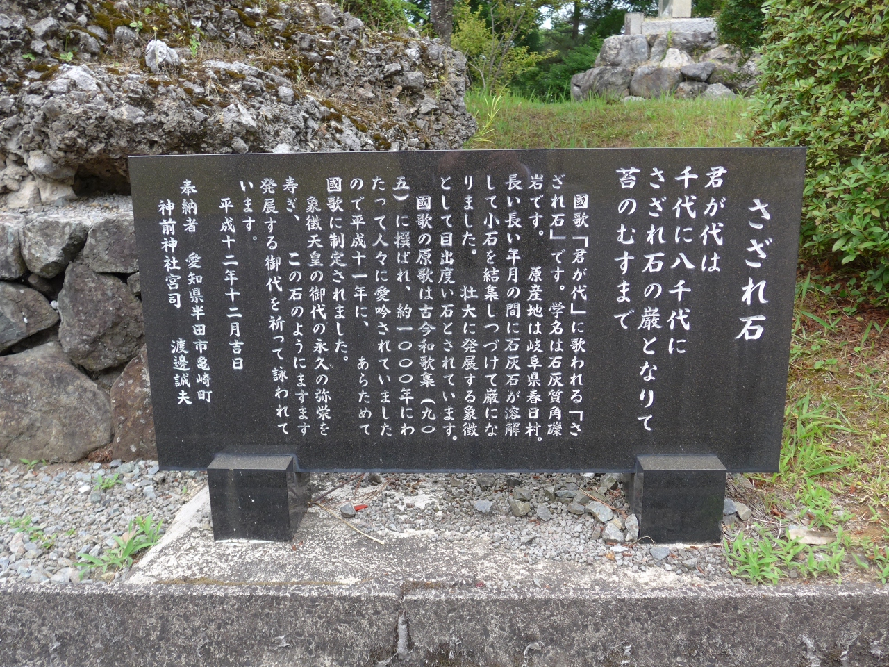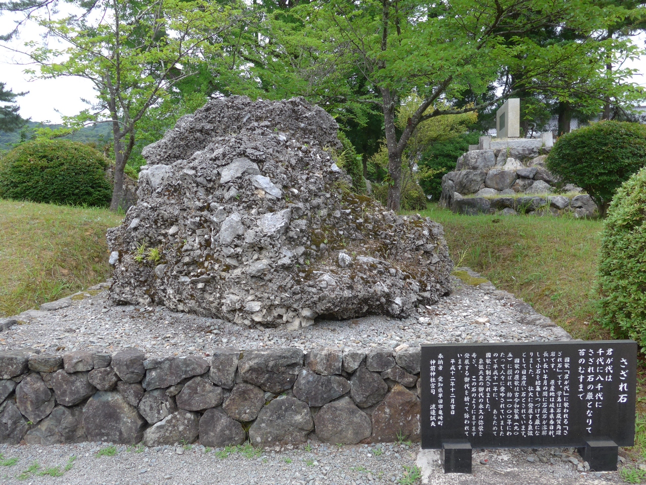 訪れて最初に目に入ってきたのがタイトルにも書き込みましたが君が代のさざれ石が参道の入口右手にあることです。初めてさざれ石を知ることになりました。