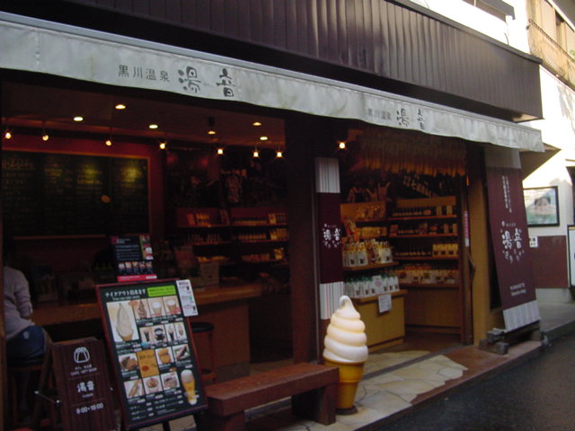 黒川温泉に泊まった初日に気になっていたお店ですが、夕方は閉まるのが早いので、翌朝に行ってみました。さっそく食べたのは湯上がりソフトクリーム。店先のベンチでのんびり食べましたが、味が濃くて、コクがあるジャージーソフトに納得。