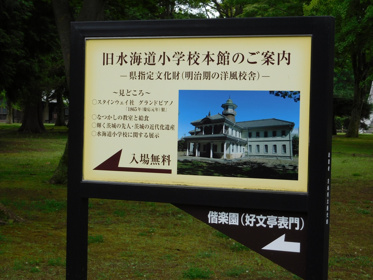 茨城県立歴史館の敷地内に、県指定文化財の「旧水海道小学校本館」と、「旧水戸農業高等学校本館」の建物があります。旧水海道小学校本館の方は、修繕工事中の為、全体が工事用のシートに覆われてしまっていたのが残念でした。一方、旧水戸農業高等学校本館は、建物の外観のみ見学が出来るようになっていました。中の見学は出来ないので、どうしても素通りしてしまう形になってしまったのが、残念でした。