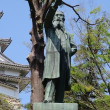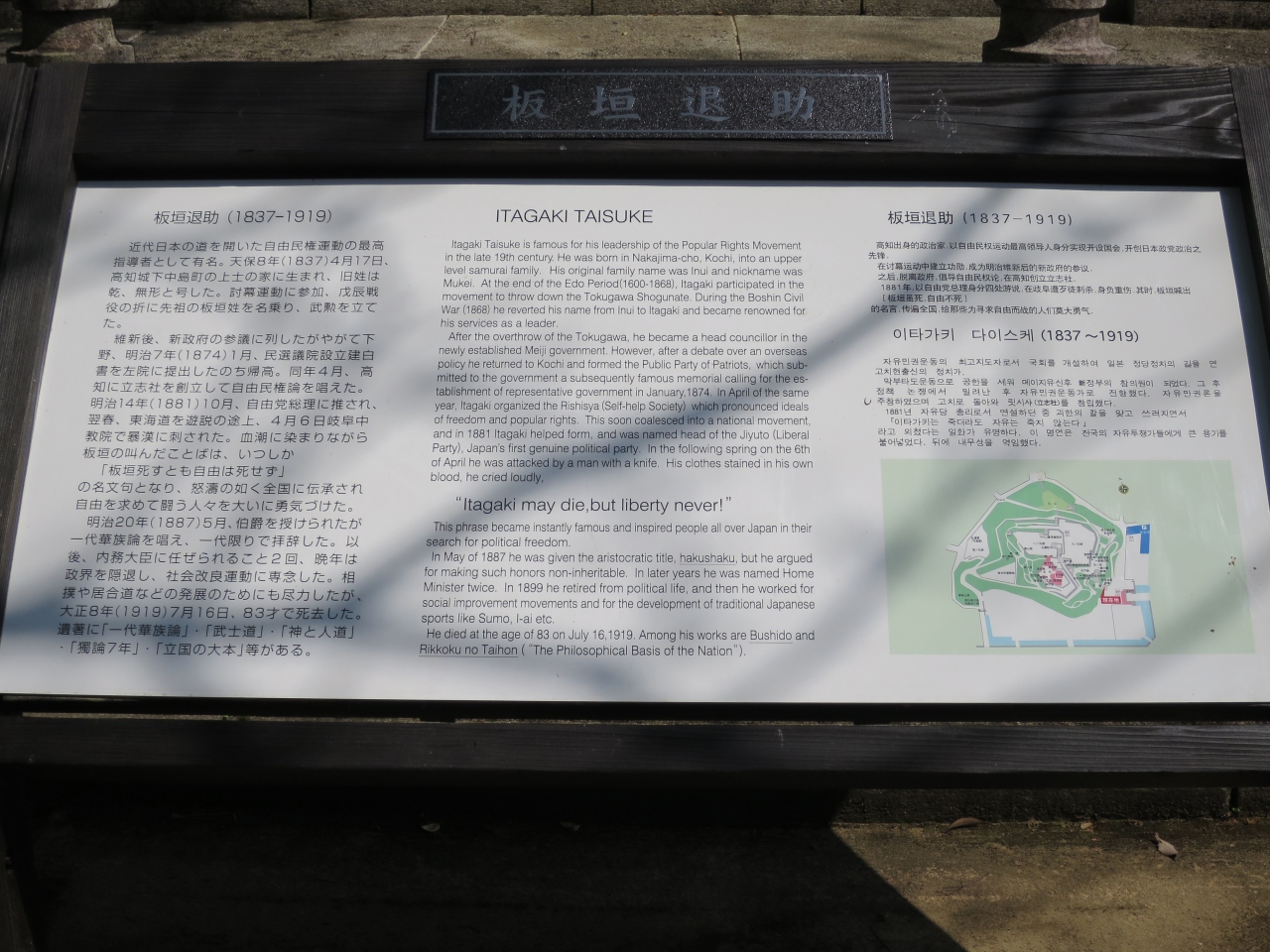 旧百円札や「板垣死すとも自由は死せず」の名言でしられる板垣退助の立像が高知城の追手門を入った広場の正面に建てられています。板垣退助の顔はまさに百円札と同じ長い髭を蓄え、演壇するような凛々しい姿です。