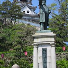 銅像は高知城が真後ろに見られるベストポジションにあり、銅像、天守を一つのフレームに収めて写真が撮れます。