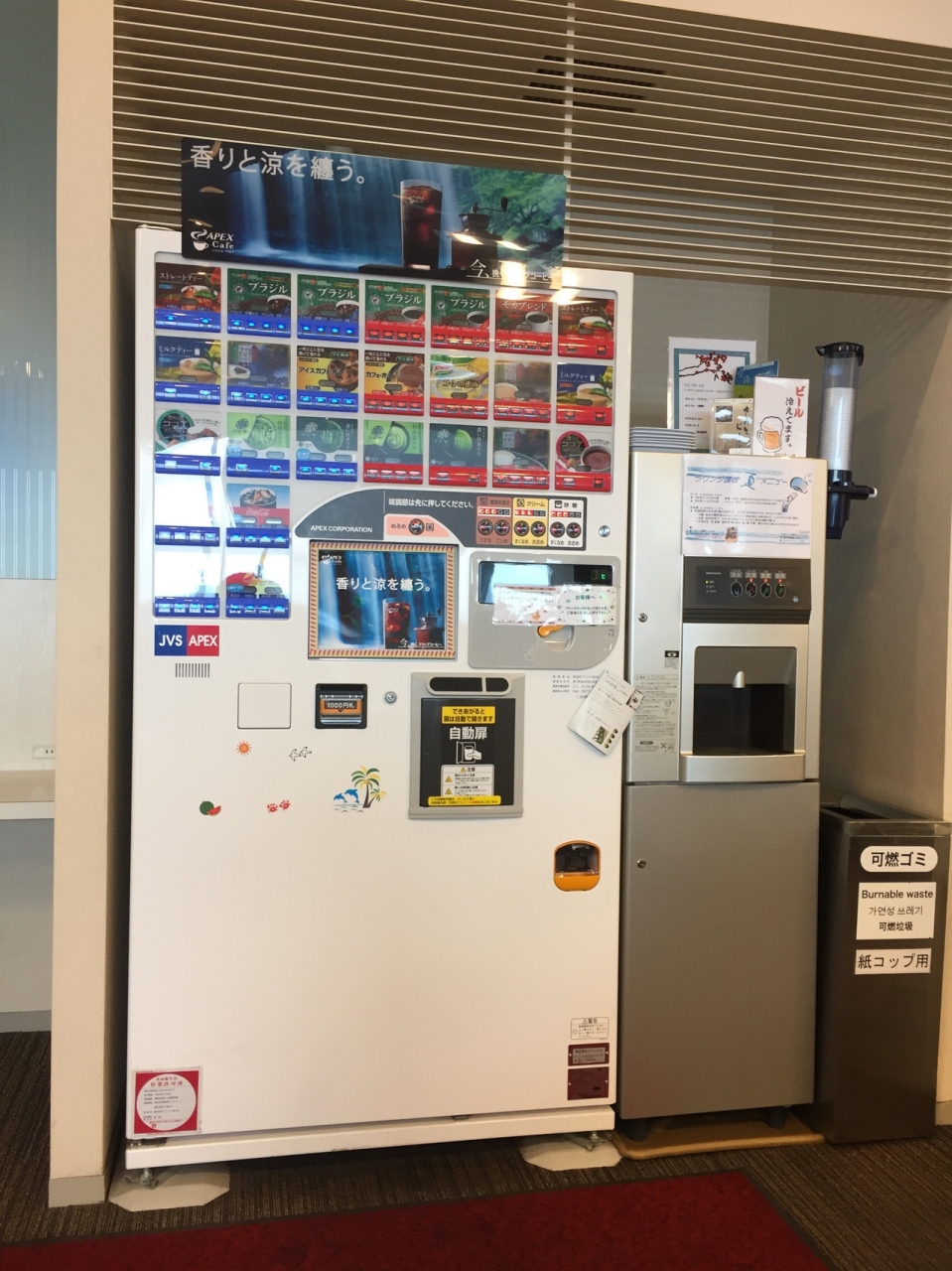 といってもクレジットカードラウンジなので、狭いし、無料のドリンクベンダーがあるだけです。ちょっと不満でしたが、落ち着く環境なのはよかったです。