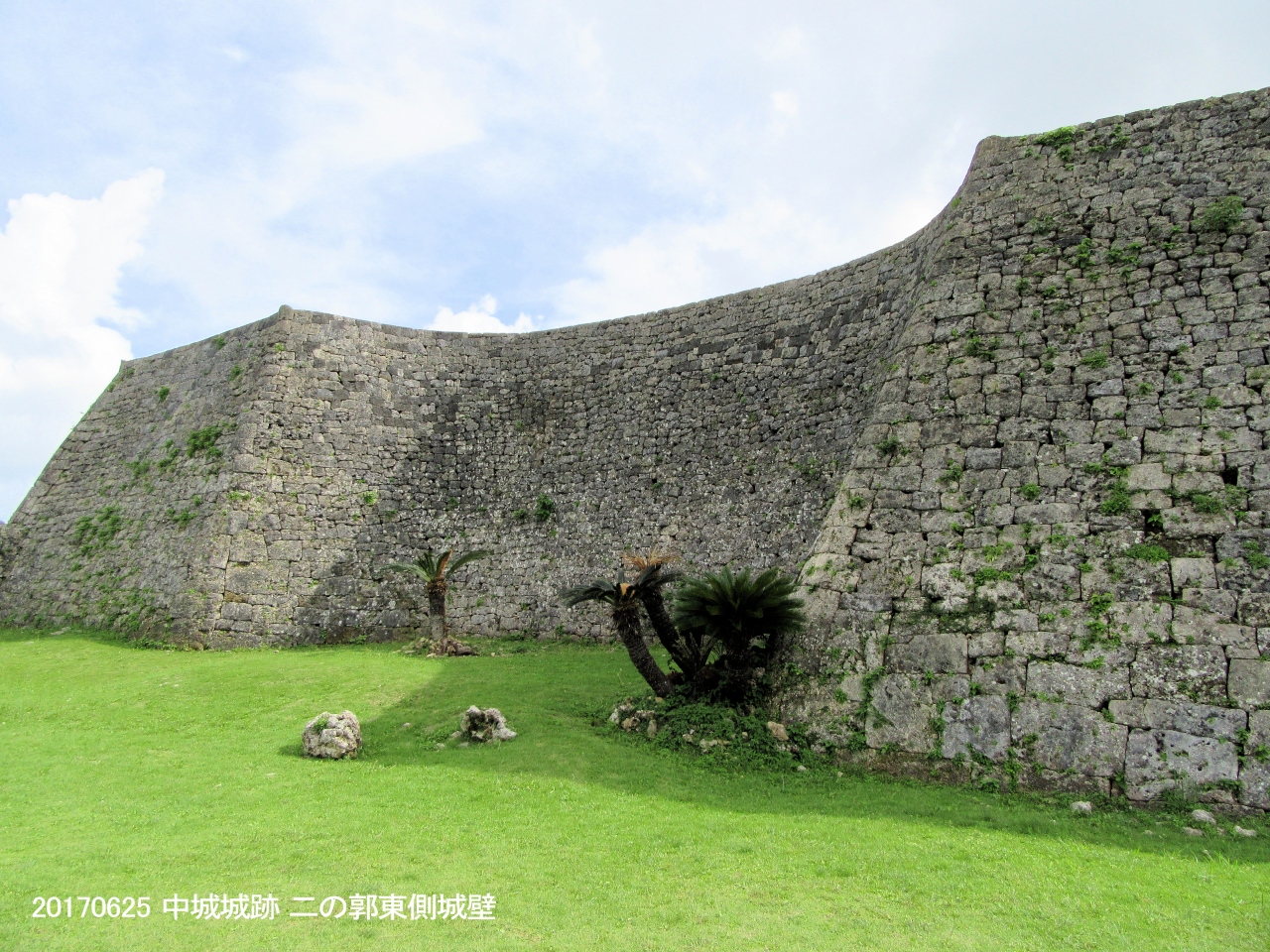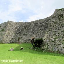 駐車場のある入り口側は城跡の裏門にあたり、入場券売り場から正門まで(500mくらい)を電動カートで送ってもらえます。正門を通って一の郭~三の郭まで順番に巡ることになりますが、世界遺産に登録された城跡の石垣は、沖縄独特の工法で湾曲するカーブが美しく、城壁の向こうに見える海と共に、異国情緒を感じることができます。ペリー艦隊が浦賀に来航する前に、この中城城跡の調査を行い賞賛したそうです。