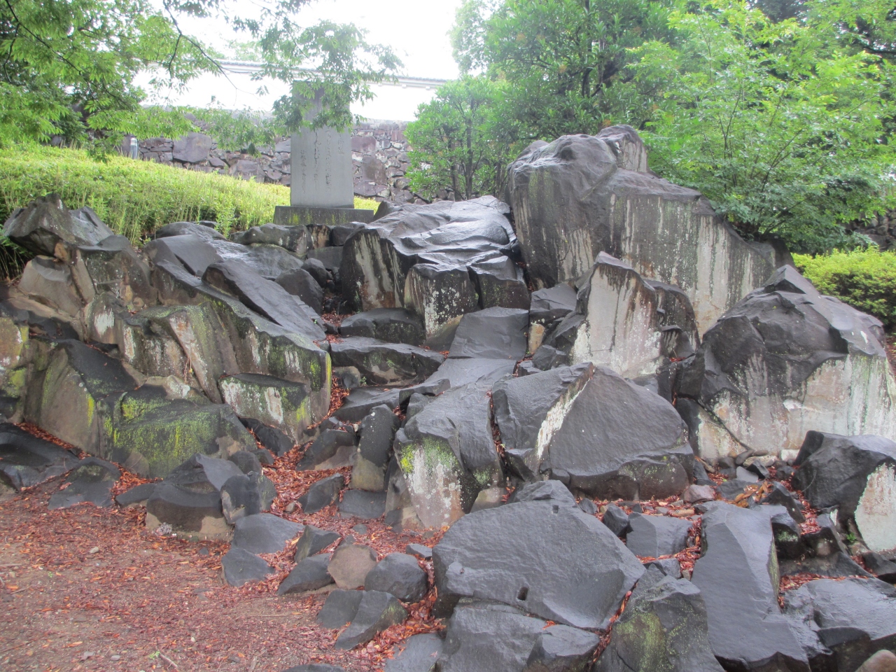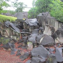 甲府駅南側に高くそびえる石垣と白壁が甲府城跡です。明治に甲府城は取り壊され現在の城壁や門や櫓は復元されたものです。石垣が目立つ城跡の南側にある芝生の自由広場の北側に石切り場があります。甲府城の石垣がこのような場所から切り出されました。案内板があるので石切り場の後だとわかりますが、自由広場から見ると木々の下にある石庭のようにも見えます。くさびの跡があり人力を感じることができます。建造物が現存しない甲府城跡に城の歴史を知る箇所があり散策すると面白いです。