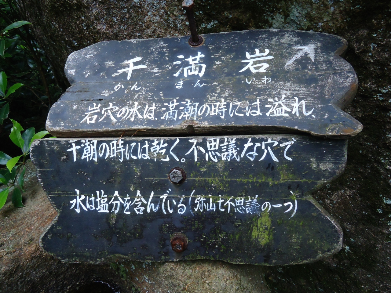 弥山の七不思議のひとつ。山頂よりすぐのことろですが、満潮と干潮で岩にある穴を覗くと中の水の水位がちがうらしいです。干潮の時に行きましたが、満潮のときをみていないのでなんとも言えません。中のみずは潮水でしょっぱいとのことですが、試してみる気にはまったくならなかったです。