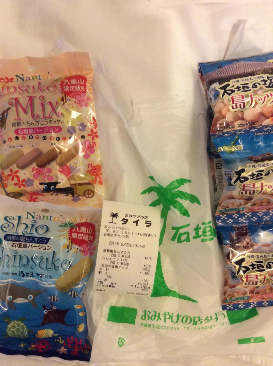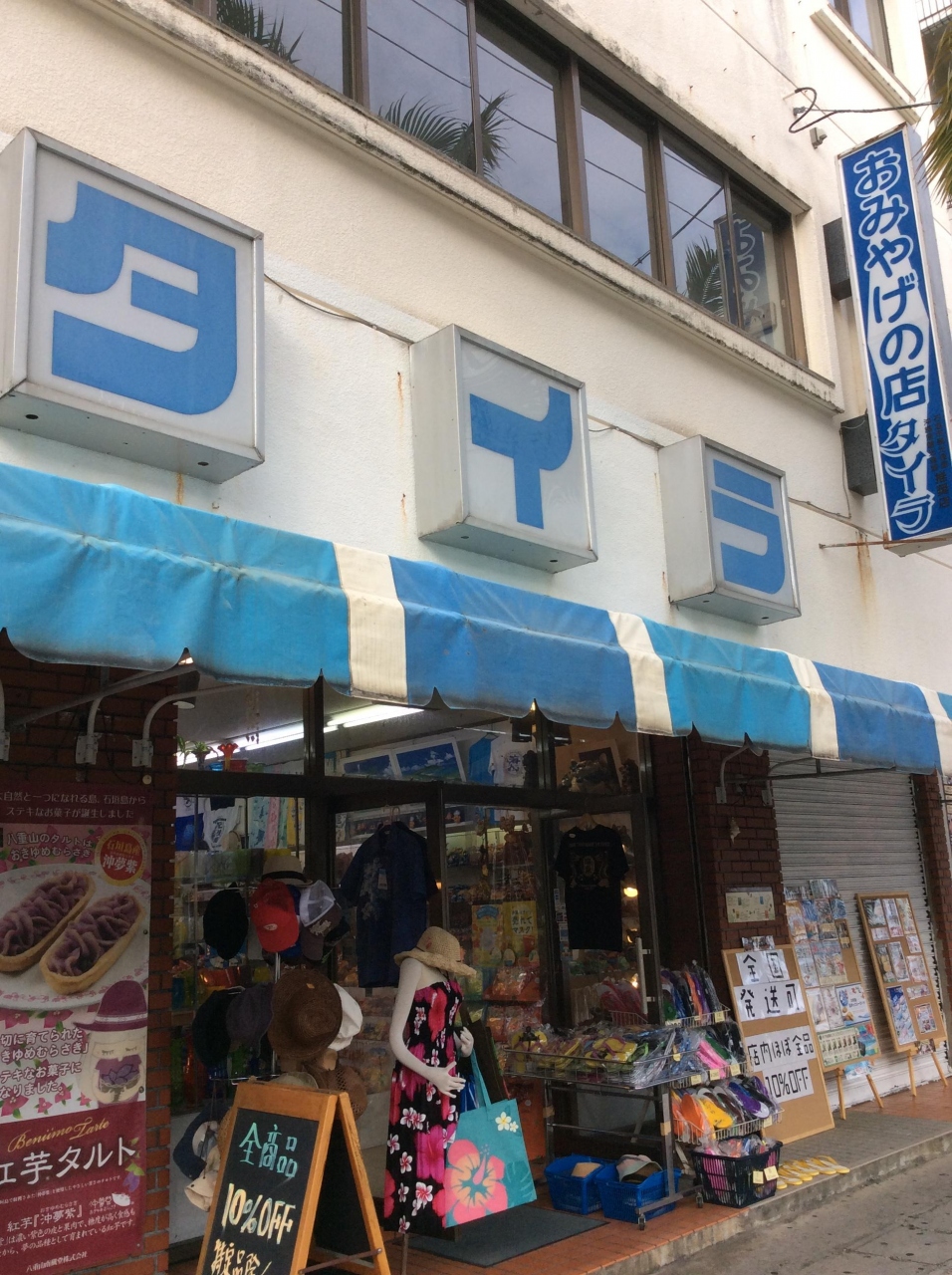 730交差点の近くで、A&Wと塩屋の間にありました。昔からあるようなお土産屋さんで、土産物はお菓子やTシャツ、シーサーの置物など一通りなんでもありました。値段も他のお店より安く、ほとんど1割引きになるようでした。マンタなどのイラストが可愛いちんすこうをお土産に買いました。