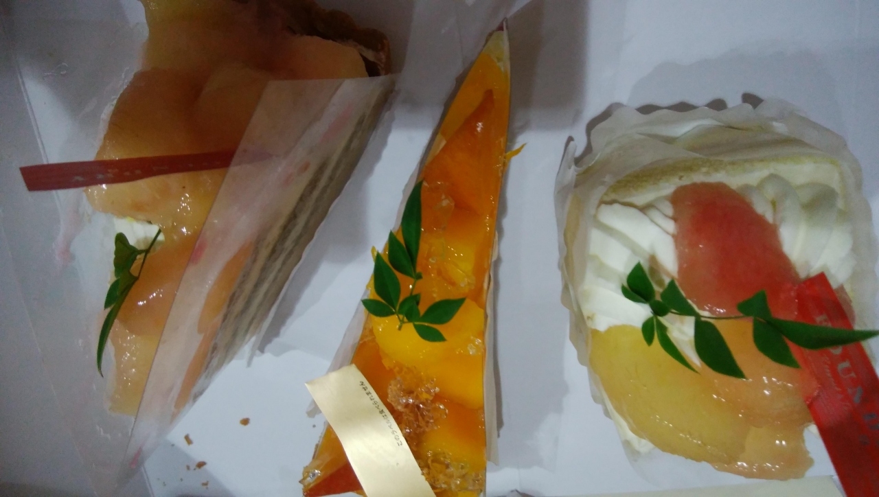 こちらは季節ごとにフルーツが変わるので、それを楽しみにちょくちょく購入するケーキ屋さんです。最近今年になり、新宿や銀座にもお店ができて、よりちょくちょく買い物しやすくなりました。焼き菓子購入の列と生ケーキ購入の列は分かれています。宮崎産のマンゴーののったタルト。中にブルーベリーのジャムがはいっていました。お値段が1カット1000円程度とちょっとお高めですが、おいしかったです。桃のショートケーキ、桃のタルトもおいしかった。桃タルトは紅茶のムースとスポンジでさっぱりたべれました。