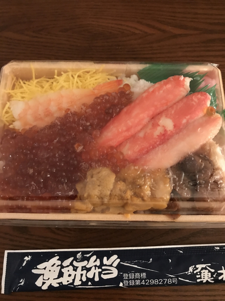 いわゆるデパ地下のお惣菜が大好きなので、西武池袋店はたびたび利用してます。ケーキやマカロンなどのお菓子のフロアやお惣菜のフロアなど、とても品ぞろえが充実しています。本日はカニ棒が三本も乗った豪華海鮮弁当です。