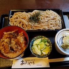 愛妻は、舞茸天丼セット(1080円)小生は、もりそば大盛りを注文しました。